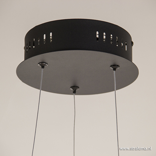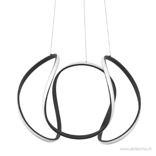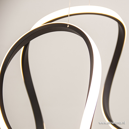 Deze moderne hanglamp met LED is een mooie eye-catcher in uw interieur. De LED lamp komt goed tot z’n recht boven een eettafel maar staat ook mooi boven een grote salontafel in de woonkamer. De mat zwarte hanglamp heeft in de krullen een LED strip verwerkt waardoor er een mooie en sfeervolle lichtverdeling plaatsvindt. De LED lamp hangt aan drie soepele koordjes die gemakkelijk zijn in te korten en wordt aan het plafond bevestigd met een ronde plafondplaat. De hanglamp is een strakke en moderne toevoeging aan uw interieur en geeft net even dat beetje meer design in huis.
