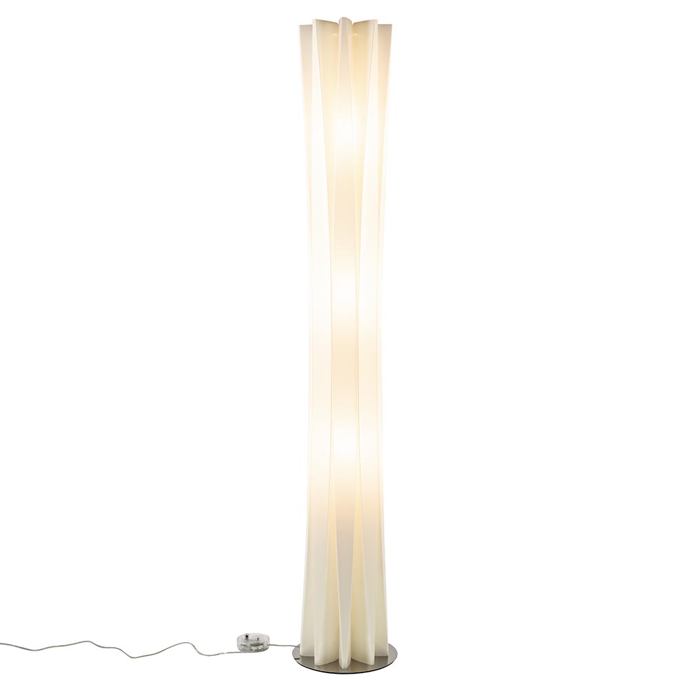 Een prachtige design vloerlamp met een luxe uitstraling. Deze gouden vloerlamp is gemaakt van kunststof en voorzien van een metalen chromen voet. De design lamp past mooi in een luxe woonstijl. In het midden is de lamp voorzien van een schroef waamee een deel van de kap kan worden los gehaald. Op deze wijze kunt u 3 lichtbronnen plaatsen. De vloerlamp heeft een snoer van 165 cm met een dimmer op 20 cm van het armatuur. De vloerlamp is verkrijgbaar in twee maten.