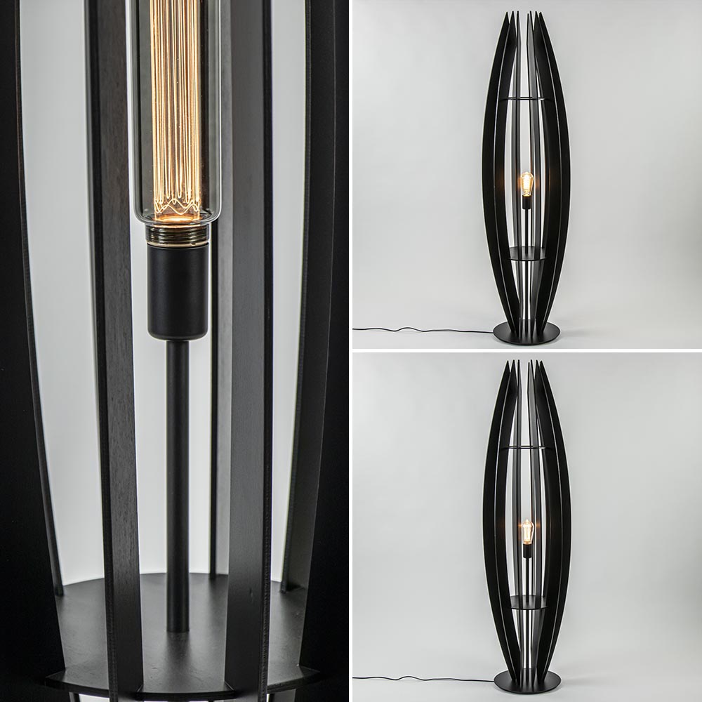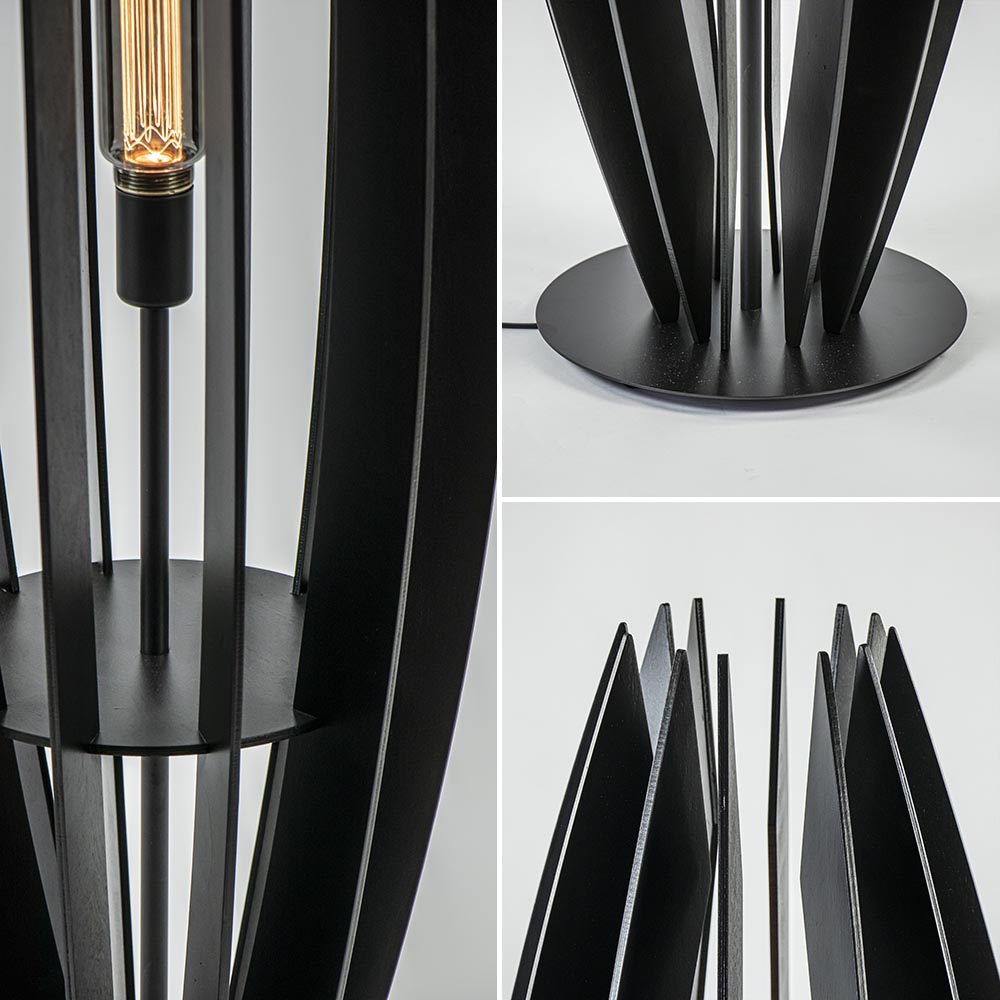 Een prachtig ontwerp en een verrijking voor het interieur. Deze vloerlamp is een ware eye-catcher in huis. De lamp is samengesteld uit houten lamellen die door twee houten ringen worden ondersteund. De staande lamp heeft een mat zwart armatuur met middenin de kap een E27 fitting. Door de hoogte van de lamp is een XL decoratieve lichtbron een mooie optie. Het mat zwarte hout heeft een onbehandelde look waardoor de tekening op de lamellen allemaal anders is. De combinatie van het hout en het matte zwarte maakt de lamp prima geschikt voor diverse woonstijlen. De houten vloerlamp is voorzien van een zwart snoer met een lengte van 270 cm, en een schakelaar op 120 cm vanaf de voet. De grote vloerlamp wordt geleverd zonder lichtbron.