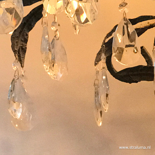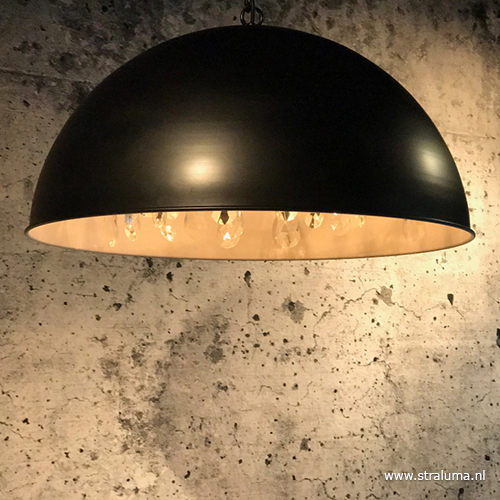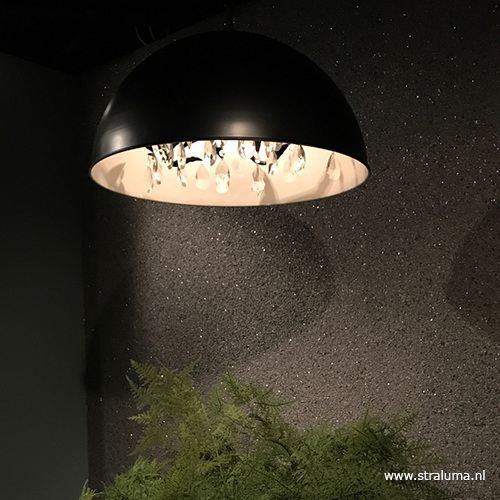 Een mooie eye-catcher voor boven uw eettafel. Deze grote koepel hanglamp in zwart/wit is aan de binnenzijde voorzien van een armatuur van metalen bladeren waar de kristalen pegels aan hangen. Dit geeft een mooi en sfeervol effect wanneer de lamp aan staat. De mat zwart hanglamp heeft een moderne look die door de kristallen een klassiek twist krijgt. De grote kap hangt aan een stevige mat zwarte ketting en wordt met een ronde bevestiging opgehangen.