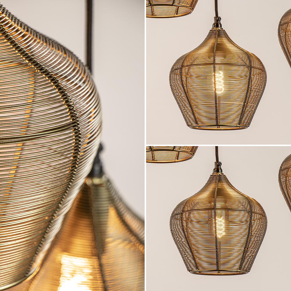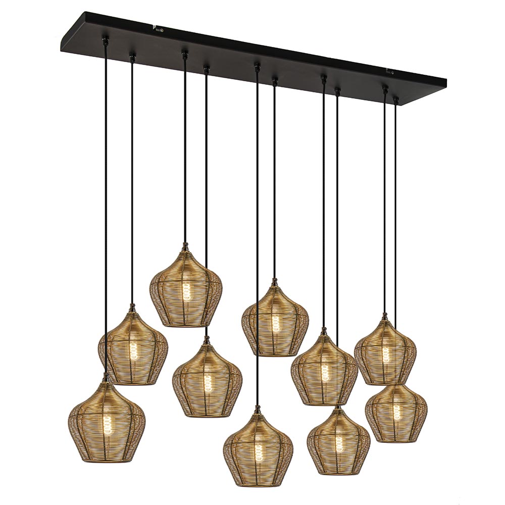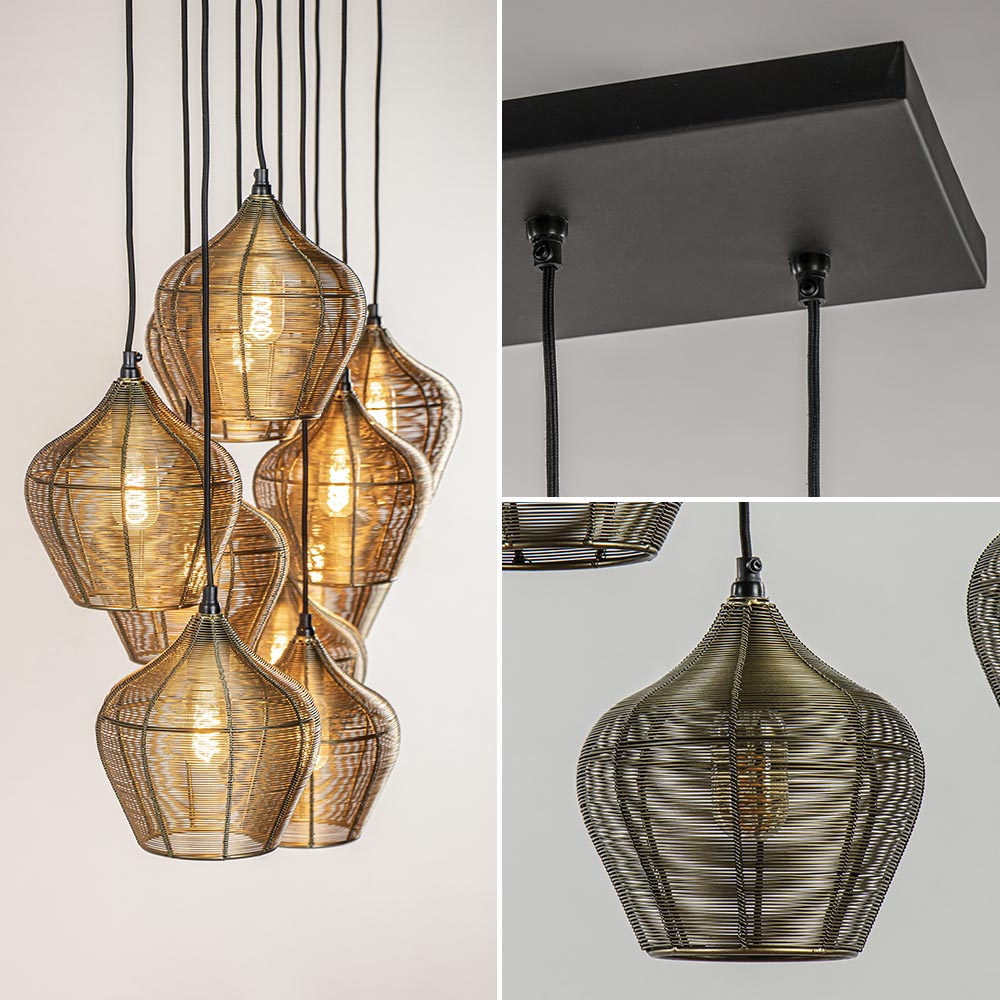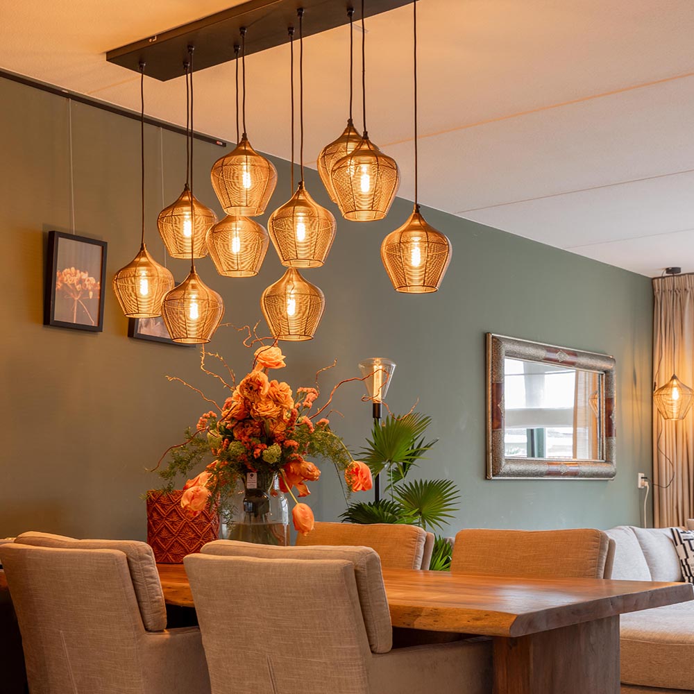 Deze grote 10 lichts hanglamp is één bonk sfeer. De kappen zijn helemaal gemaakt van metaal draad dat om een frame is gewikkeld. Het draad heeft een antiek-brons afwerking en daarmee een warme uitstraling. De kappen hebben een open structuur dus raden aan decoratieve lichtbronnen te gebruiken. De kapjes hangen met een zwart stof omwonden snoer aan de grote plafondplaat. De lampen zijn eenvoudig in hoogte verstelbaar, snoeren ijn gemakkelijk weg te werken in de grote plafondplaat. Deze prachtige hanglamp is prachtig boven een grote eettafel. Mooi in een klassiek, oosters of landelijk interieur.