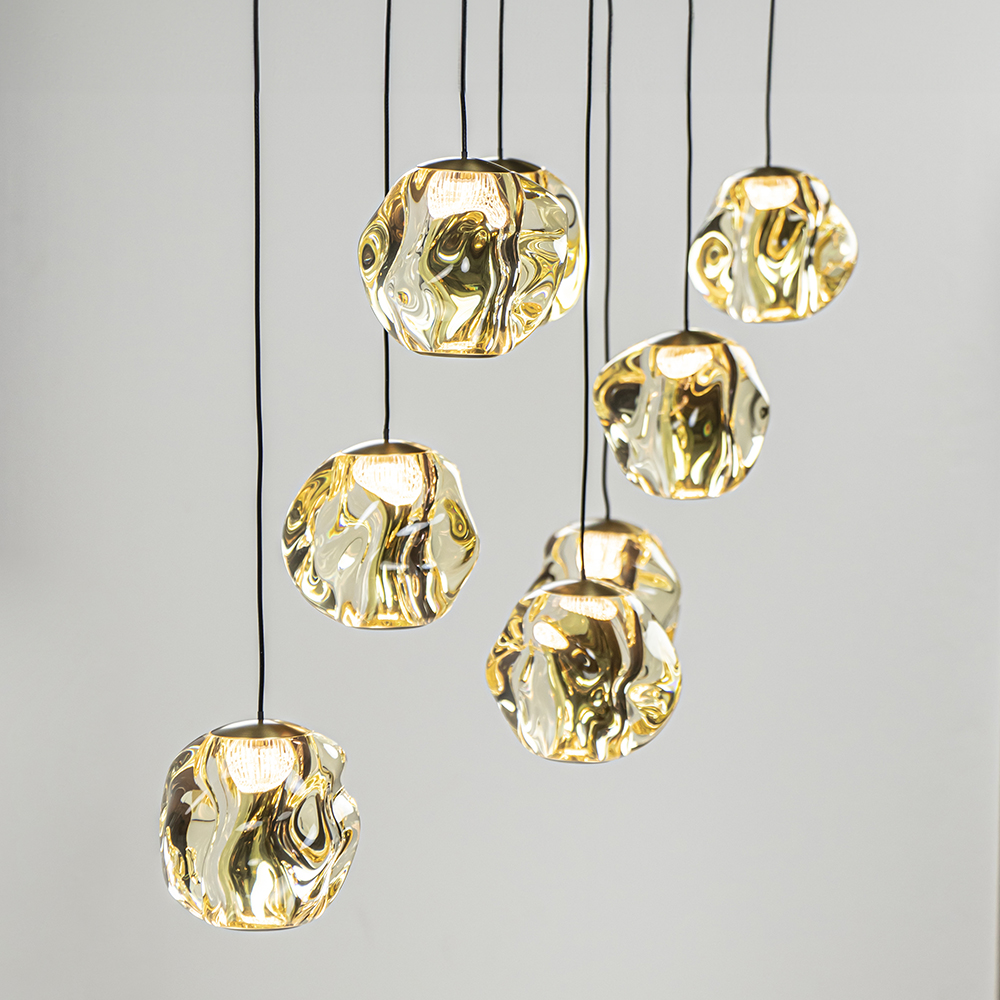 Een prachtige stijlvolle 8-lichts hanglamp die de eetkamer elegant verrijkt. De LED hanglamp heeft organische kappen van glas in de kleur amber. Dit is gecombineerd met metalen details in het mat zwart en brushed gold. De samenstelling geeft een glamoureuze uitstraling aan de lamp. De kappen zijn van binnen voorzien van geïntegreerd LED en verspreiden mooi en sfeervol warm wit licht naar beneden. Zo wordt de tafel onder de lamp goed uitgelicht. Dit is dimbaar middels een externe dimmer (exclusief). De 8-lichts eettafelhanglamp is gemakkelijk in hoogte te verstellen en heeft een maximale hoogte van 165 cm.