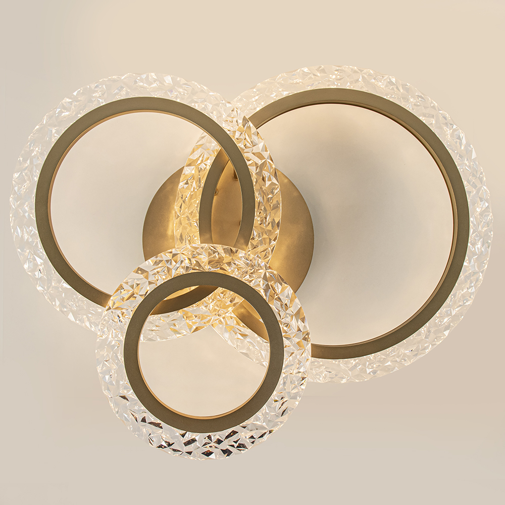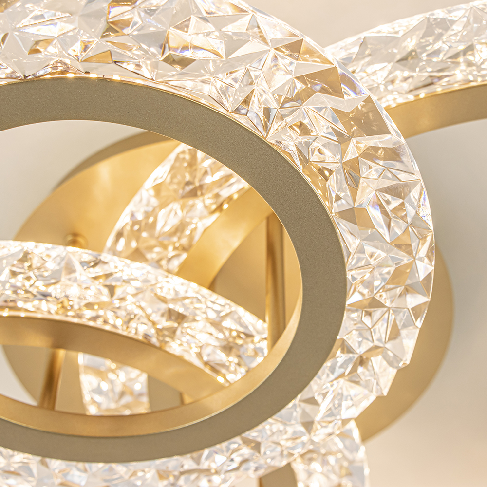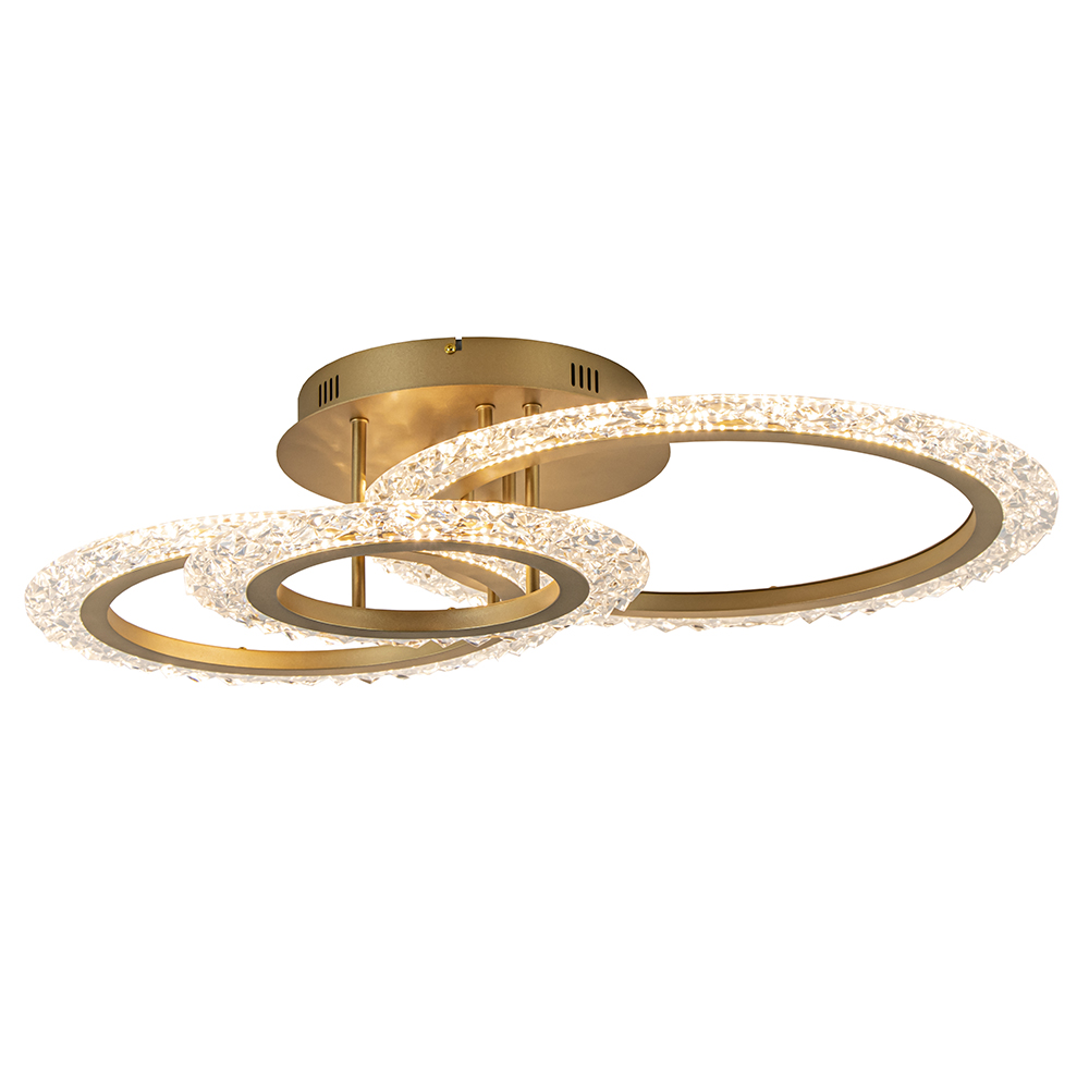Deze grote LED plafondlamp is een ware eyecatcher in het interieur. Prima geschikt voor een ruimte als de woon- of slaapkamer. De plafondlamp is uitgevoerd in het goed en is gecombineerd met kunststof ringen die zijn voorzien van een kristaleffect. Dit geeft de plafondlamp een externe luxe en chique uitstraling. De ringen overlappen elkaar en zorgen voor een warm witte lichtverspreiding. De gouden plafondlamp is dimbaar middels een externe dimmer (exclusief).