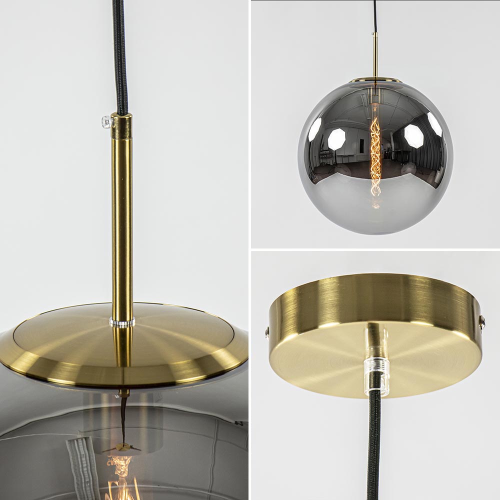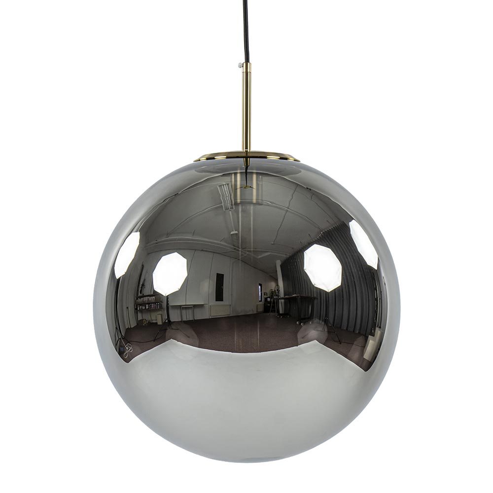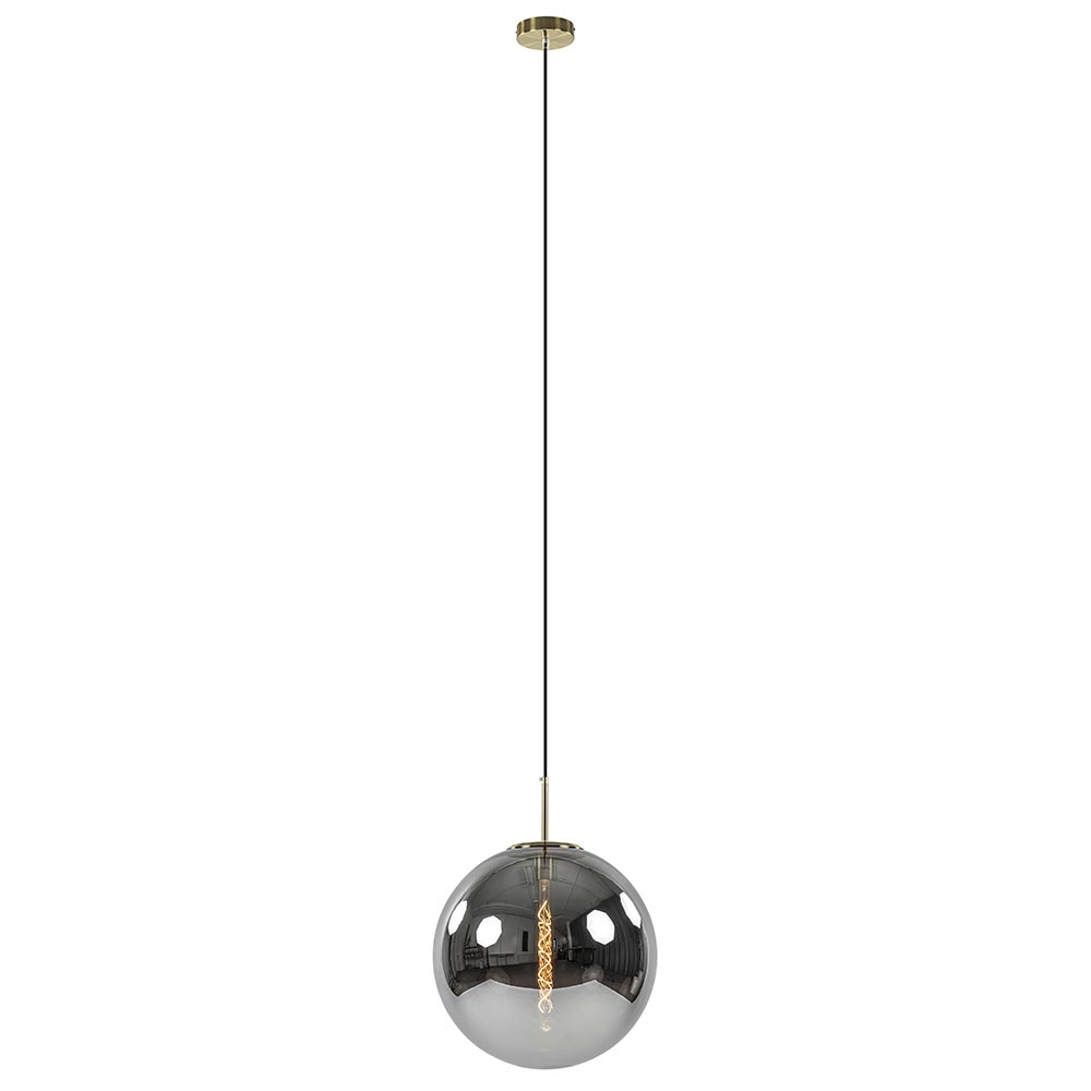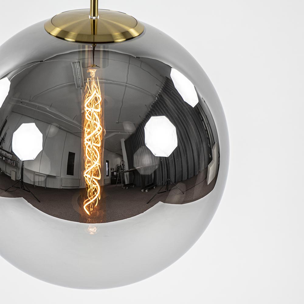 Grote smoke glas bol met een diepe titanium glans. Wanneer de lamp uit staat is het glas als een spiegel. Wanneer de lamp aan is heeft deze een prachtige warme grijze kleur. Bovenaan het glas zit een bronzen ring. Hierin wordt de pendel met fitting geschroefd. De glanzende bol is dan helemaal afgesloten. Deze chique hanglamp is prachtig boven de eettafel in de salontafel in een luxury interieur, maar werkt ook goed in een klassiek, modern of hotel chic interieur. De pendel en de plafondbevestiging zijn beide uitgevoerd in antiek-brons. De lamp hangt aan een zwart stof omwonden snoer.