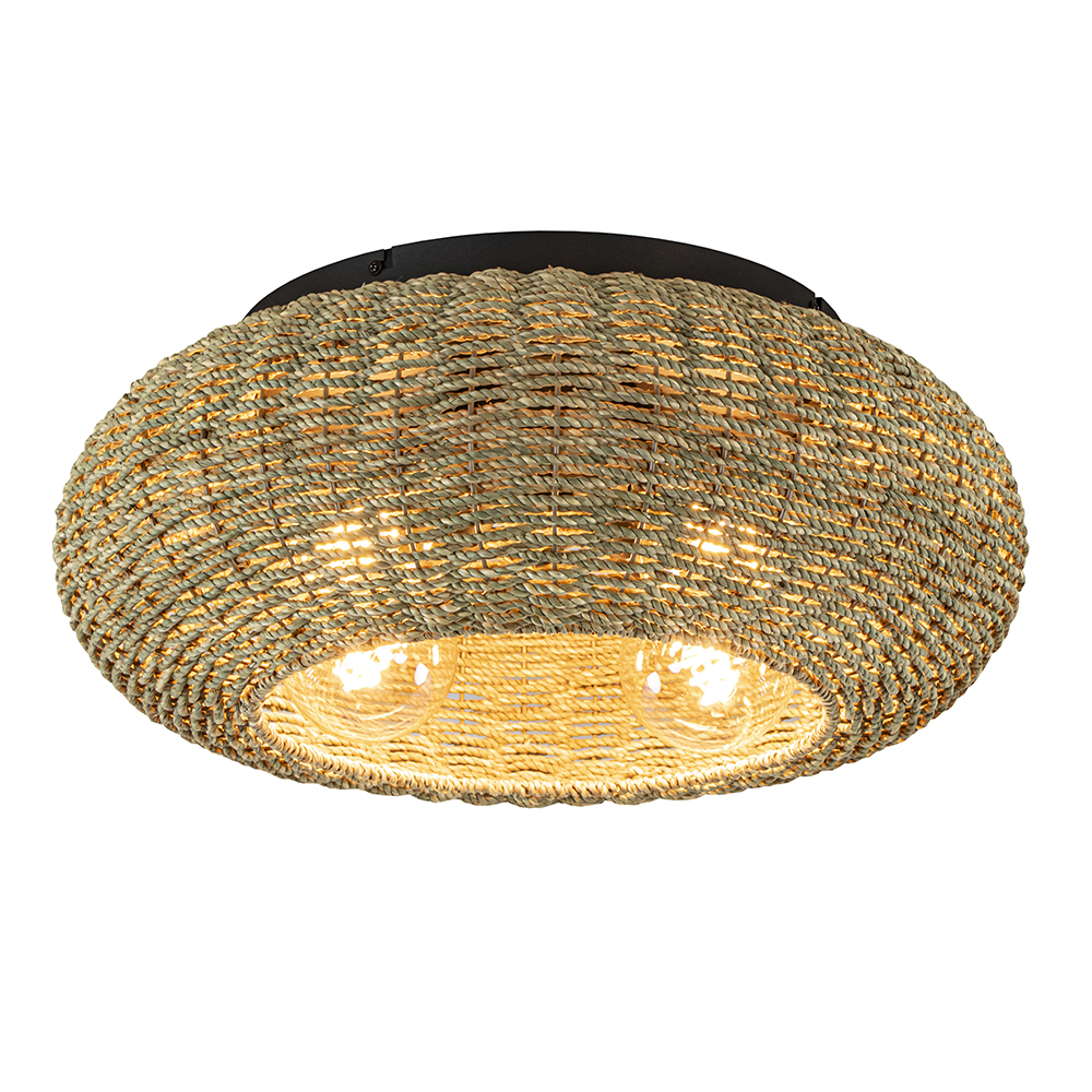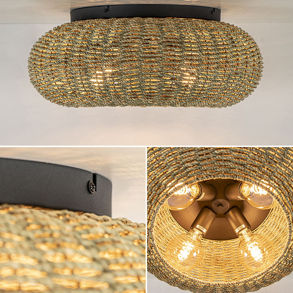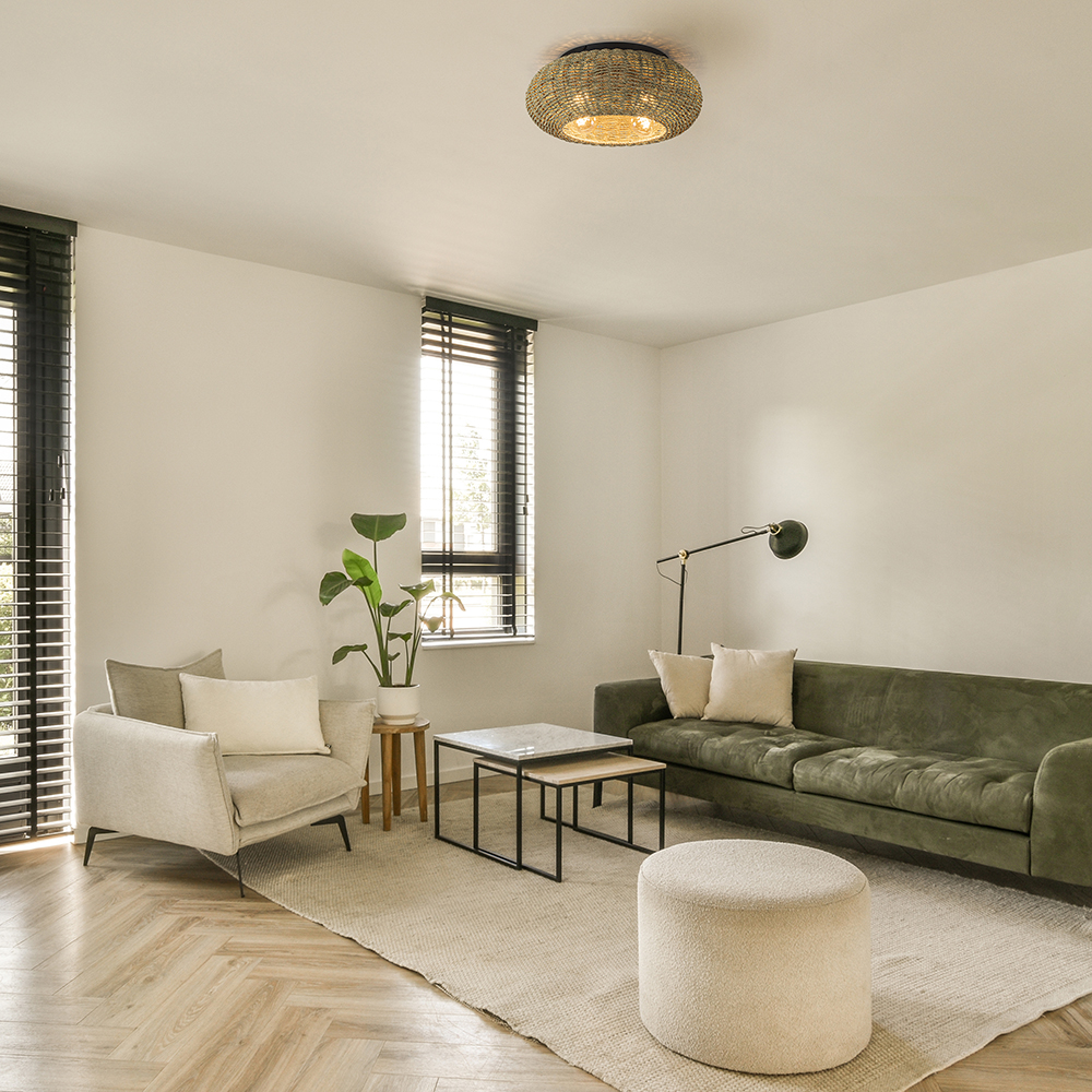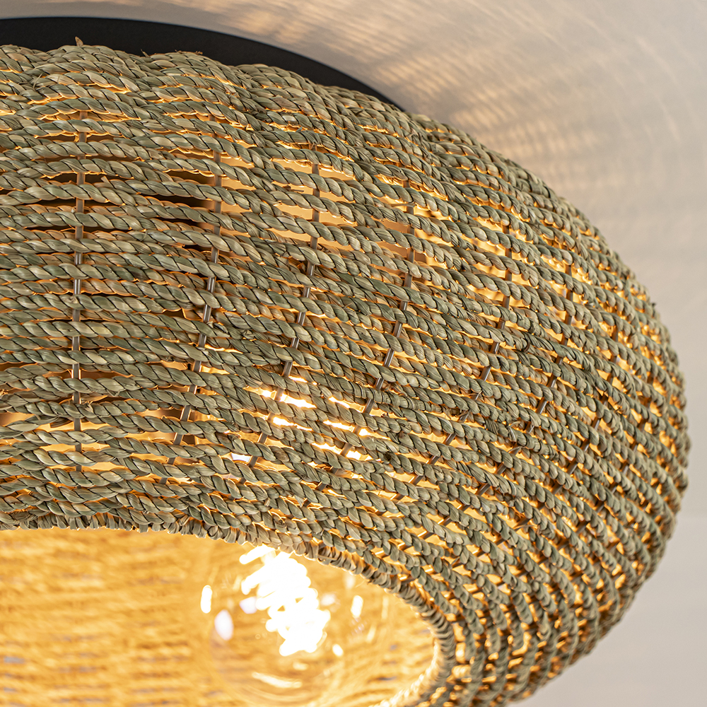In de botanische trend zijn veel natuurlijke en duurzame materialen te vinden. Deze plafondlamp past daar perfect bij doordat deze is gemaakt van touw. Dit is strak om een frame gespannen en gevlochten wat de kap een leuk effect geeft. Door z’n grootte past de plafondlamp is diverse ruimtes als de hal, woonkamer of slaapkamer. De plafondlamp wordt geleverd exclusief lichtbron.