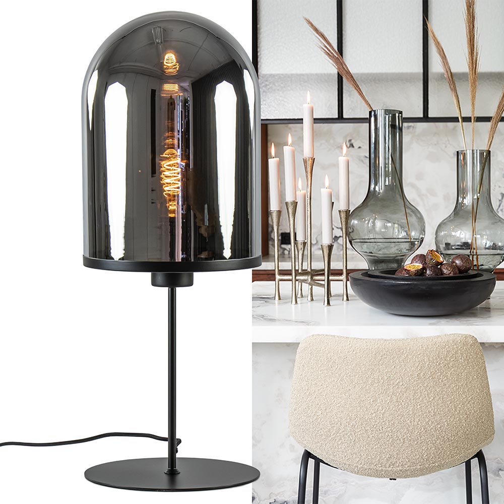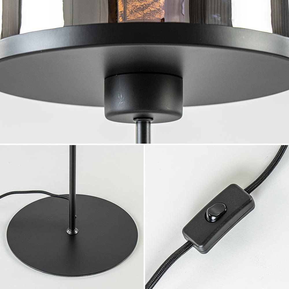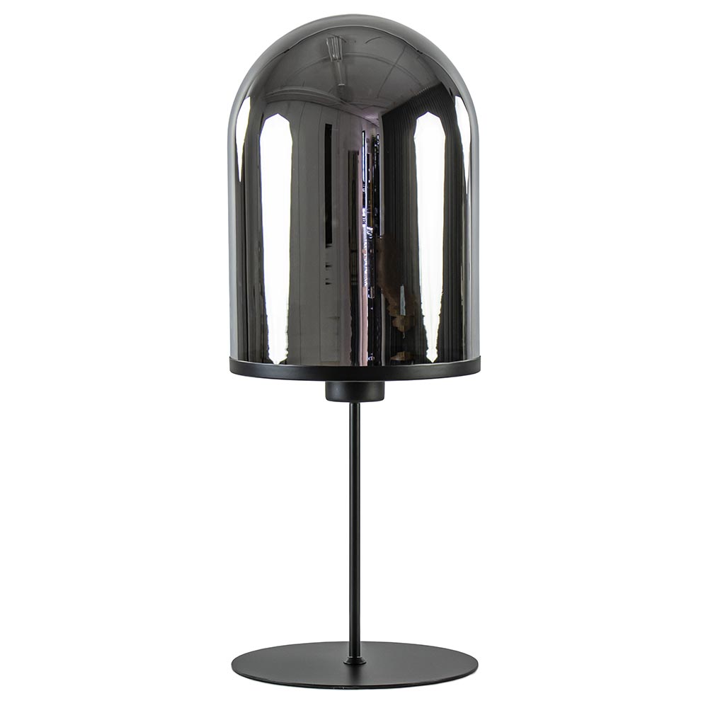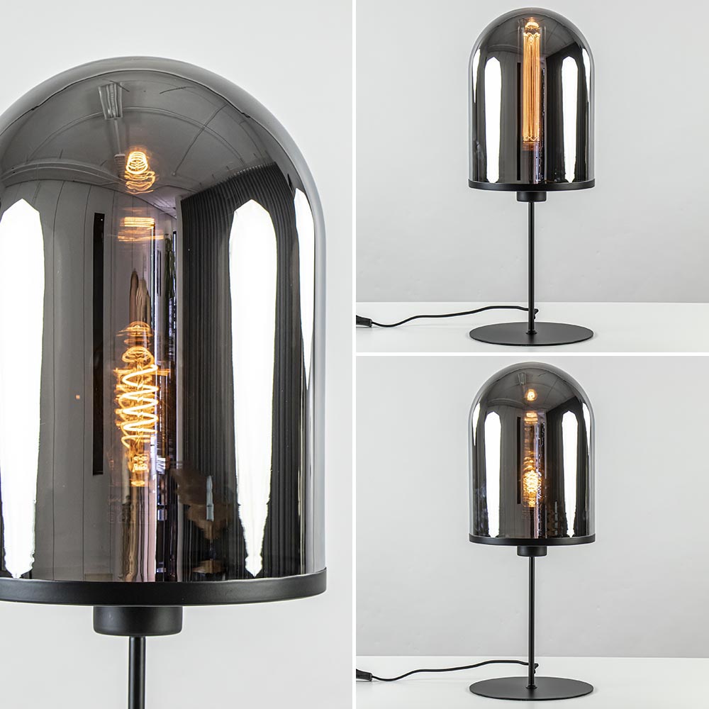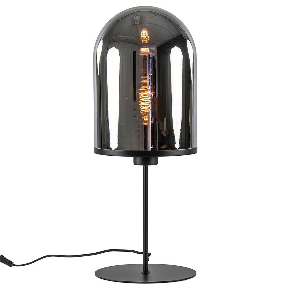 Modern met een luxe uitstraling. Deze metalen mat zwarte tafellamp is voorzien van een smoke glazen stolp met een spiegelend effect. Zodra de lamp is uitgeschakeld spiegeld het glas z’n omgeving, schakelt u de lamp in, dan wordt het glas smoke, oftewel donker transparant. Dit effect zorgt voor de luxe uitstraling van de lamp en wordt versterkt door de vorm van het glas. Het smokey glas wordt ondersteund door een metalen voet die is afgewerkt met een mat zwarte finish. De zwarte tafellamp is voorzien van een zwart snoer van 180 cm, de schakelaar bevindt zich op 40 cm van het armatuur. Let op, de tafellamp wordt geleverd zonder lichtbron (E27).