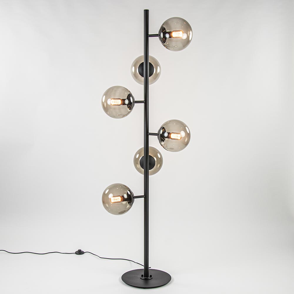 Deze flinke vloerlamp is een mooie eyecather voor de woonkamer. De 6-lichts vloerlamp heeft een metalen armatuur dat is uitgevoerd in het zwart. Over het armatuur zijn op speelse wijze de smoke glazen bollen verdeeld. Deze worden met veertjes op de fittingen vastgezet zodat ze mooi aansluiten en niet gemakkelijk los raken. Het armatuur wordt ondersteund door een ronde voet en is voorzien van een zwart snoer met een lengte van 220 cm. In het snoer bevindt zich een voetschakelaar zodat u de lamp gemakkelijk aan of uit kunt zetten. De moderne 6-lichts vloerlamp wordt geleverd zonder lichtbron (6x E27).