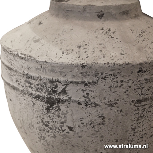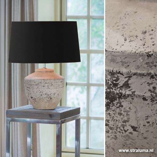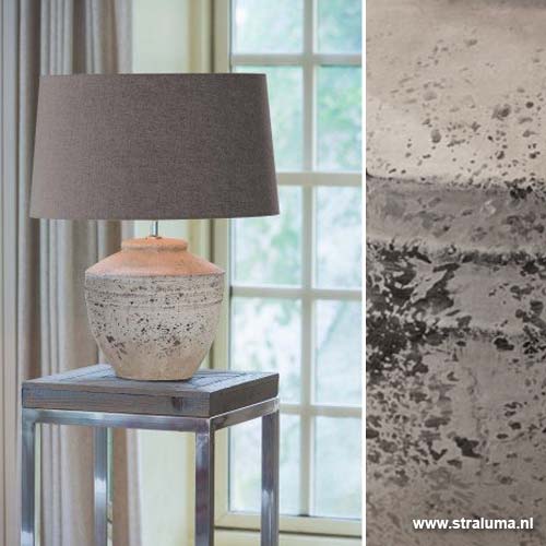 Stoere, robuuste betonlook vaas Toba met verweerd uiterlijk in licht en donkergrijs. De onderzijde heeft een doorsnede van 16 cm en het breedste gedeelte heeft een doorsnede van ca 30 cm. Hoogte van de vaas is 31 cm. Doordat u zelf bepaald wat voor model en kleur kap u op deze vaaslamp plaatst past hij perfect in uw landelijke of lifestyle interieur.