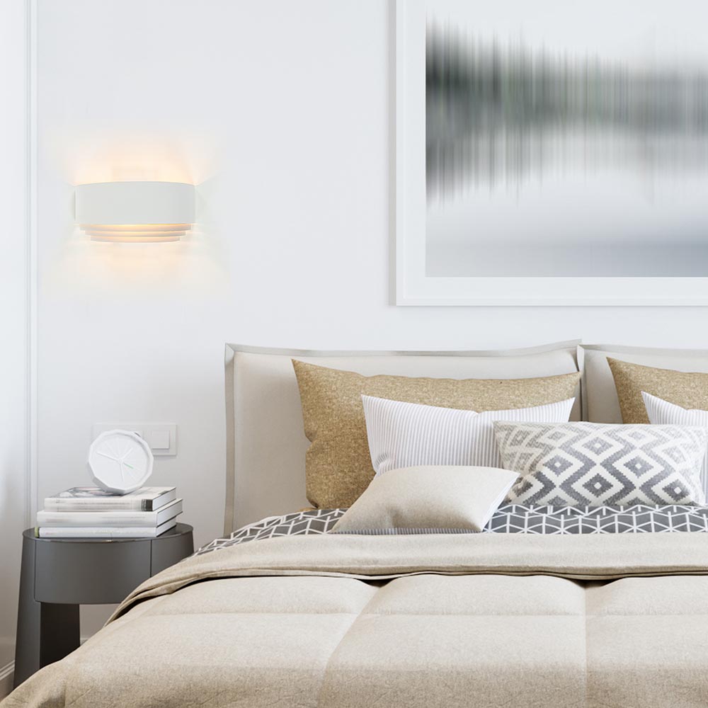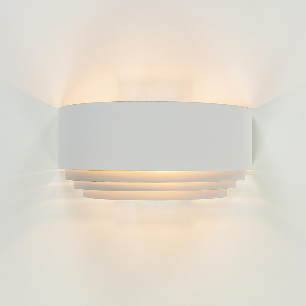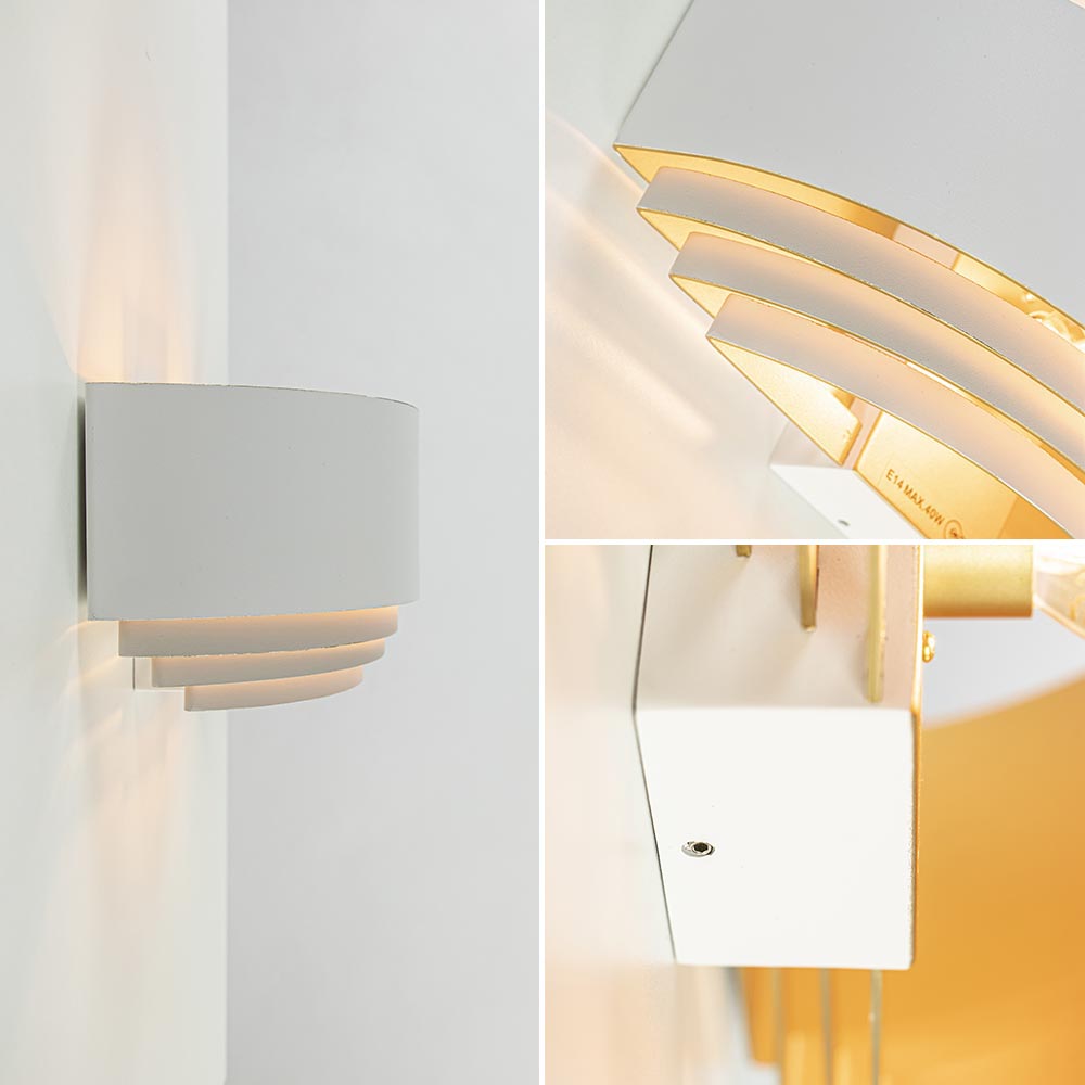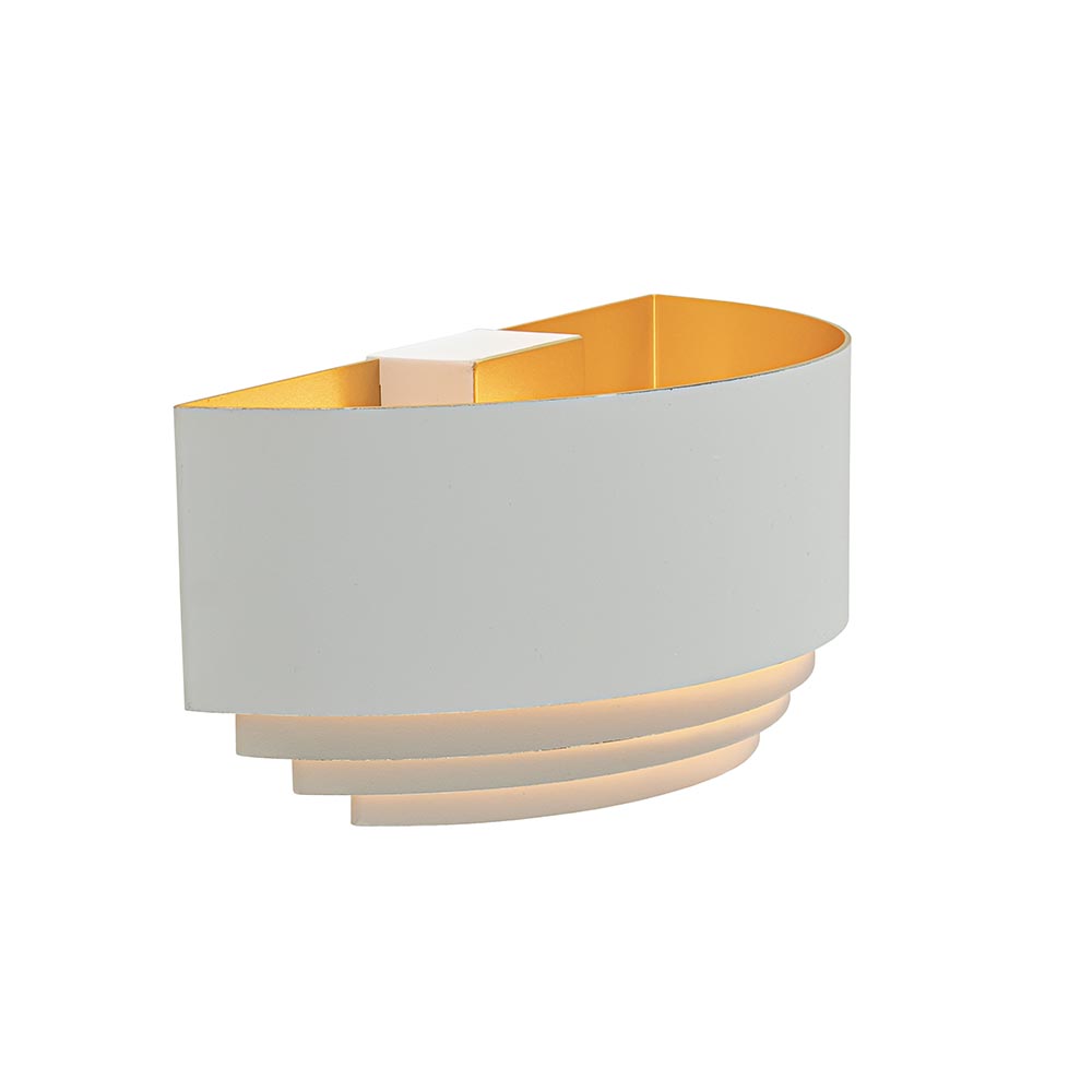 Een fijne toevoeging aan het interieur, leuk voor in de hal, woonkamer of naast het bed in de slaapkamer. Deze half ronde wandlamp is gemaakt van metaal en uitgevoerd in het wit met goud. De gouden binnenzijde geeft de wandlamp een luxe uitstraling en zorgt voor een sfeervolle verlichting. De witte wandlamp bestaat uit half ronde stroken in diverse breedtes. Dit geeft de wandlamp een speels effect en zorgt ook dat de verlichting onder en boven anders wordt verspreid. De up+down wandlamp wordt geleverd zonder lichtbron en is dimbaar middels een externe dimmer (exclusief). De half ronde lamp is niet voorzien van een snoer.