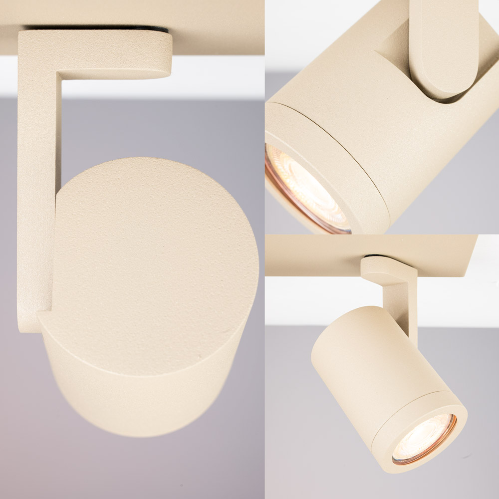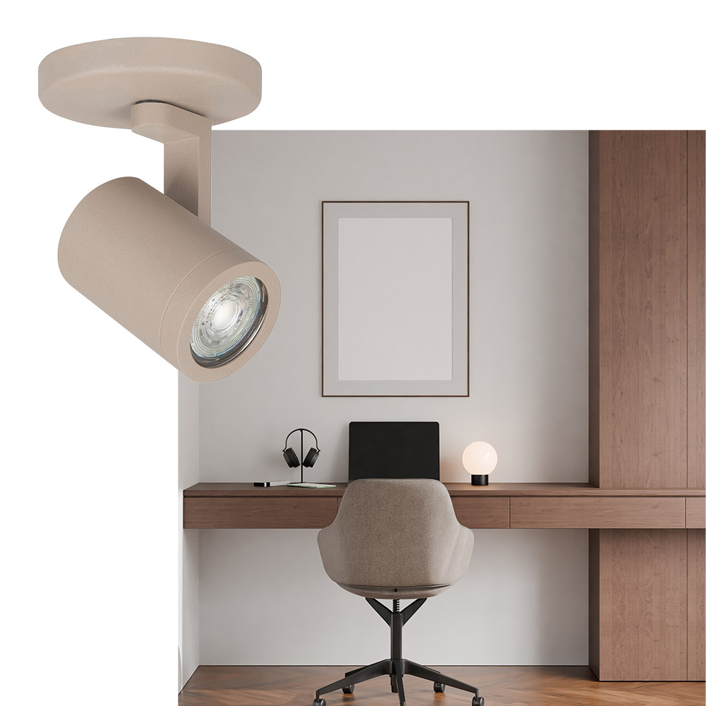 Highlights • Verkrijgbaar in 6 modellen: rond en balkvormig, van 1 tot 4 lichtpunten • Uitgevoerd in twee warme matte kleuren: zand en bruin • Ook verkrijgbaar in andere kleuren, zoals zwart, wit, goud en RVS • Volledig draai- en kantelbare spots voor gericht licht • Makkelijke schroefdop voor het eenvoudig plaatsen van een GU10 lichtbron • Strakke basis gecombineerd met mooi afgeronde spotkoppen • Geschikt als basisverlichting én accentverlichting • Dimbaar met een geschikte GU10 lichtbron via wanddimmer of wandschakelaar