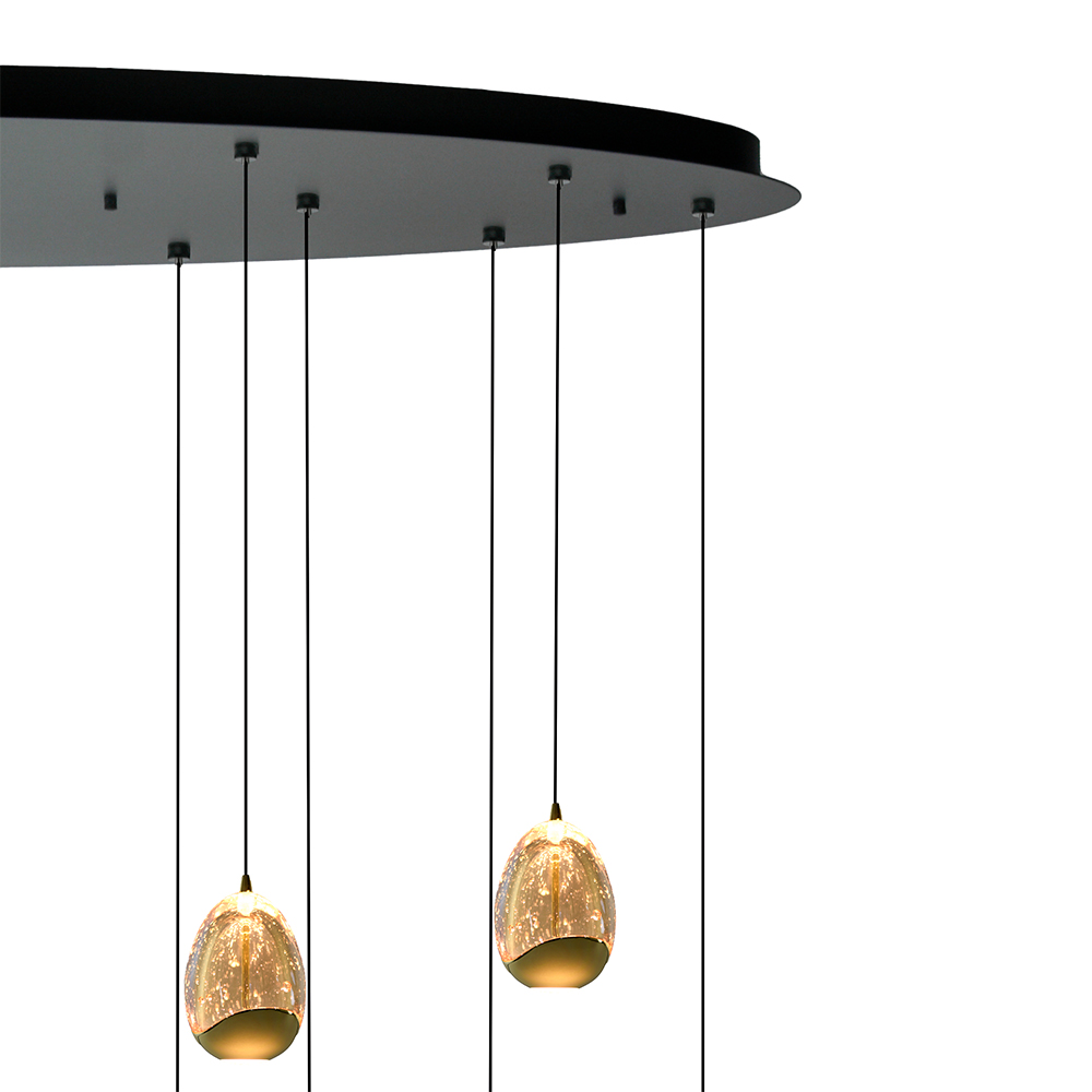 Maak een statement in je interieur met de spectaculaire Golden Egg 18-lichts hanglamp. Deze indrukwekkende lamp is een waar kunstwerk aan het plafond en tilt elke ruimte naar een hoger niveau. De 18 hangende lichtpunten, elk in de vorm van een elegant goud ei, zijn vervaardigd uit mondgeblazen glas met een subtiele bubbelstructuur, wat zorgt voor een prachtig sprankelend lichteffect. De glazen bollen zijn in hoogte te verstellen tot max 160 cm en hangen aan een grote, ovale plafondplaat in zwart metaal, wat een stijlvol contrast vormt met het warme gouden glas. Ideaal boven een kookeiland, eettafel of in een vide waar ruimte is voor een echte blikvanger.