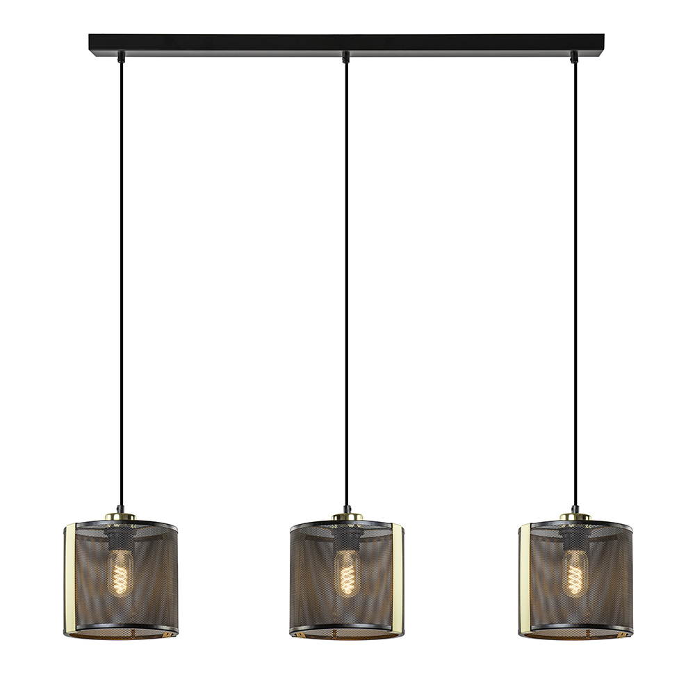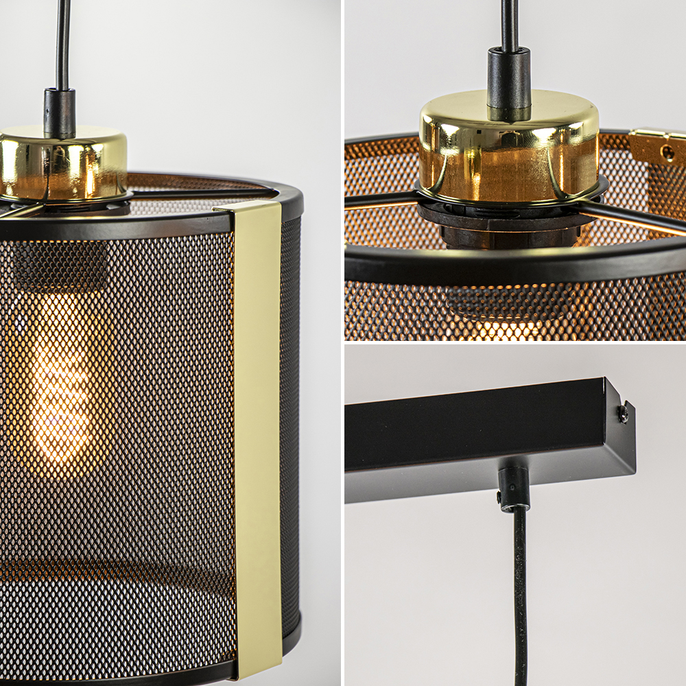 Transformeer uw eettafel met deze 3-lichts hanglamp, die een perfecte balans tussen stijl en functionaliteit biedt. De lichtbronnen van de lamp zijn omgeven door zwart met goud getinte cilinders, die ook nog eens doorschijnend zijn. De tijdloze combinatie van zwart en goud en deze doorschijnendheid maken het een veelzijdige keuze die zich moeiteloos aanpast aan uw eetruimte en de algehele sfeer aan tafel verrijkt.