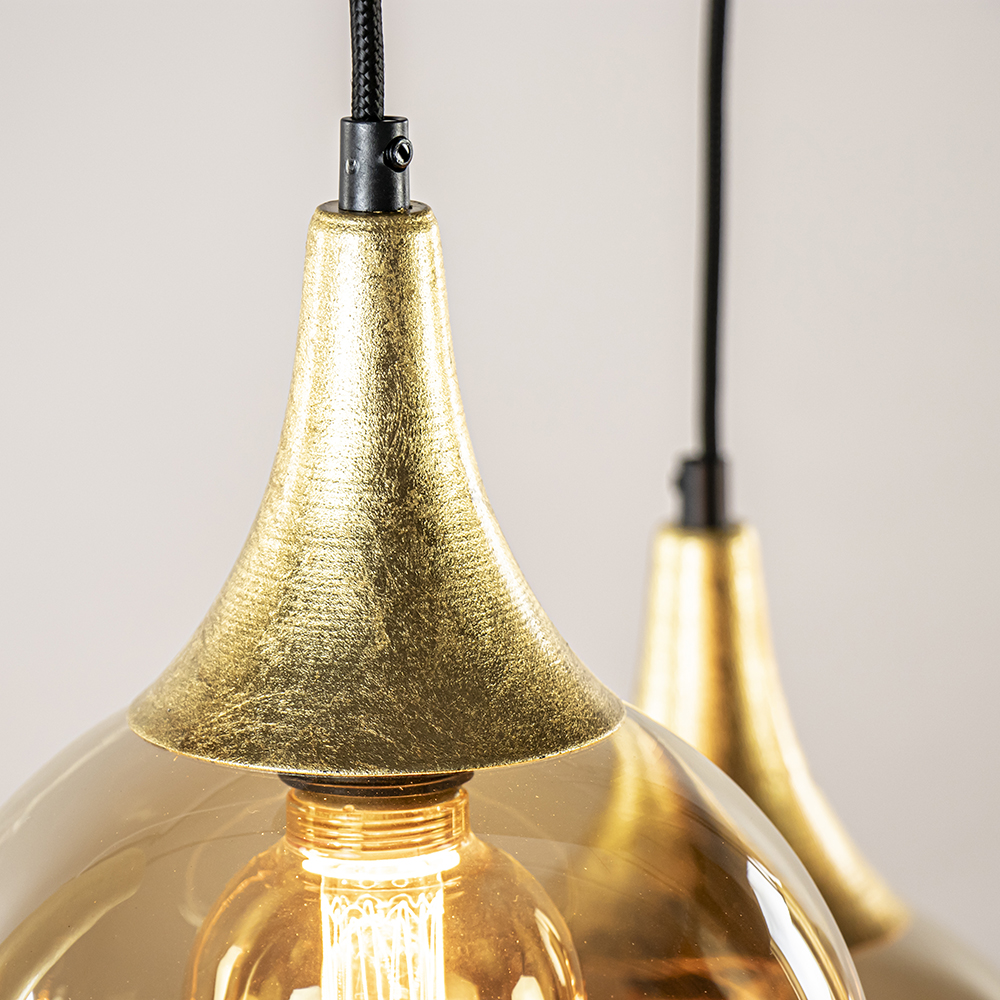 Speciaal laten maken deze mooie luxe 5-lichts hanglamp. De combinatie van amber/gouden glazen met bladgoud is super chique. De glazen lampen geven een mooie sfeer en breed licht, de pijpen daarentegen zorgen voor direct licht op de tafel. Ideaal zodat u kunt genieten van een sfeervolle maar ook functionele hanglamp. Het goud dat lijkt op bladgoud wordt er met de hand opgebracht zodat geen pijp of fitting hetzelfde is. Dit zorgt voor een warme en luxe uitstraling.