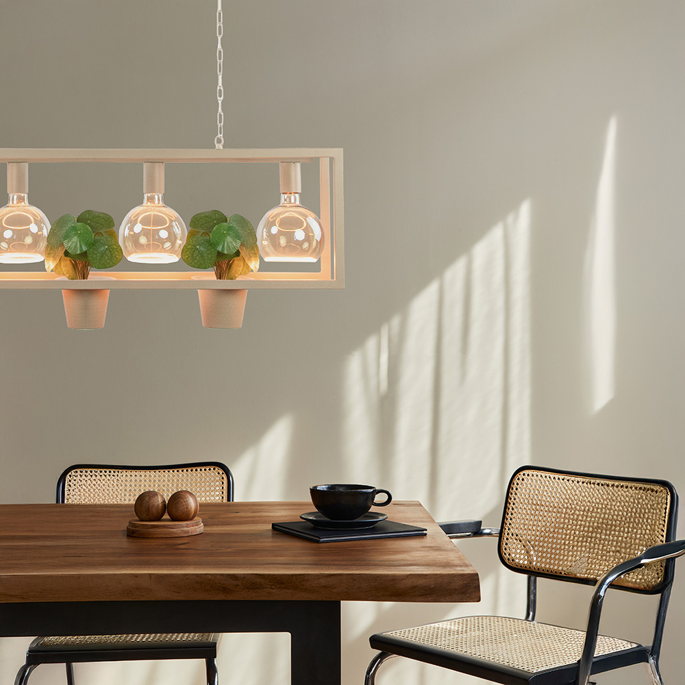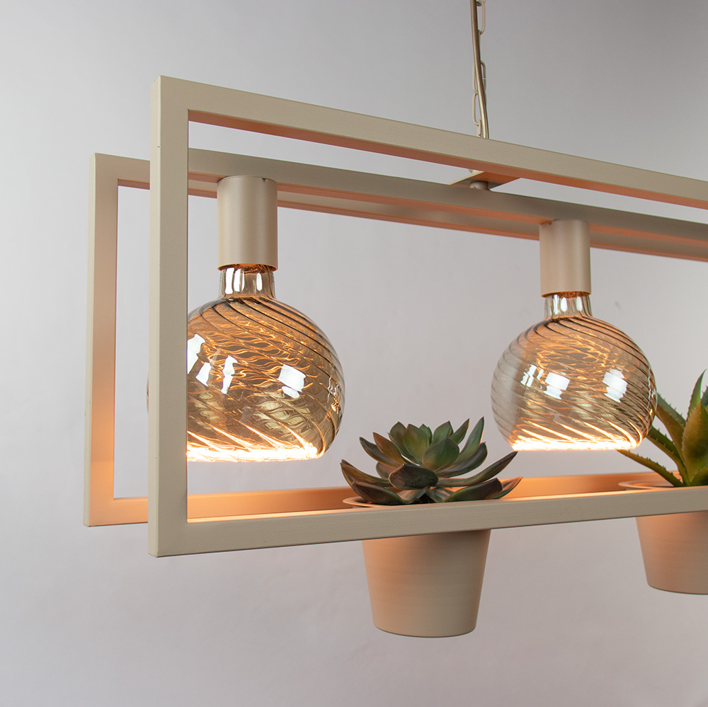 Plantenliefhebbers opgelet! Maak kennis met deze moderne hanglamp die de eetruimte zal verblijden. Deze leuke hanglamp combineert licht, design en groen op een prachtige manier. De lamp bestaat uit een metalen frame van 150 cm, waar 5 lichtbronnen en 4 bloempotten in worden geplaatst. Perfect om wat meer groen in huis te halen. Door de keuze in lichtbronnen en plantjes kun je de lamp helemaal eigen maken! Dit model verlicht dus niet alleen de eetruimte maar fleurt de boel ook nog eens op, maar het ontwerp van deze hanglamp zorgt ook voor een luxueuze en innovatieve sfeer in huis.