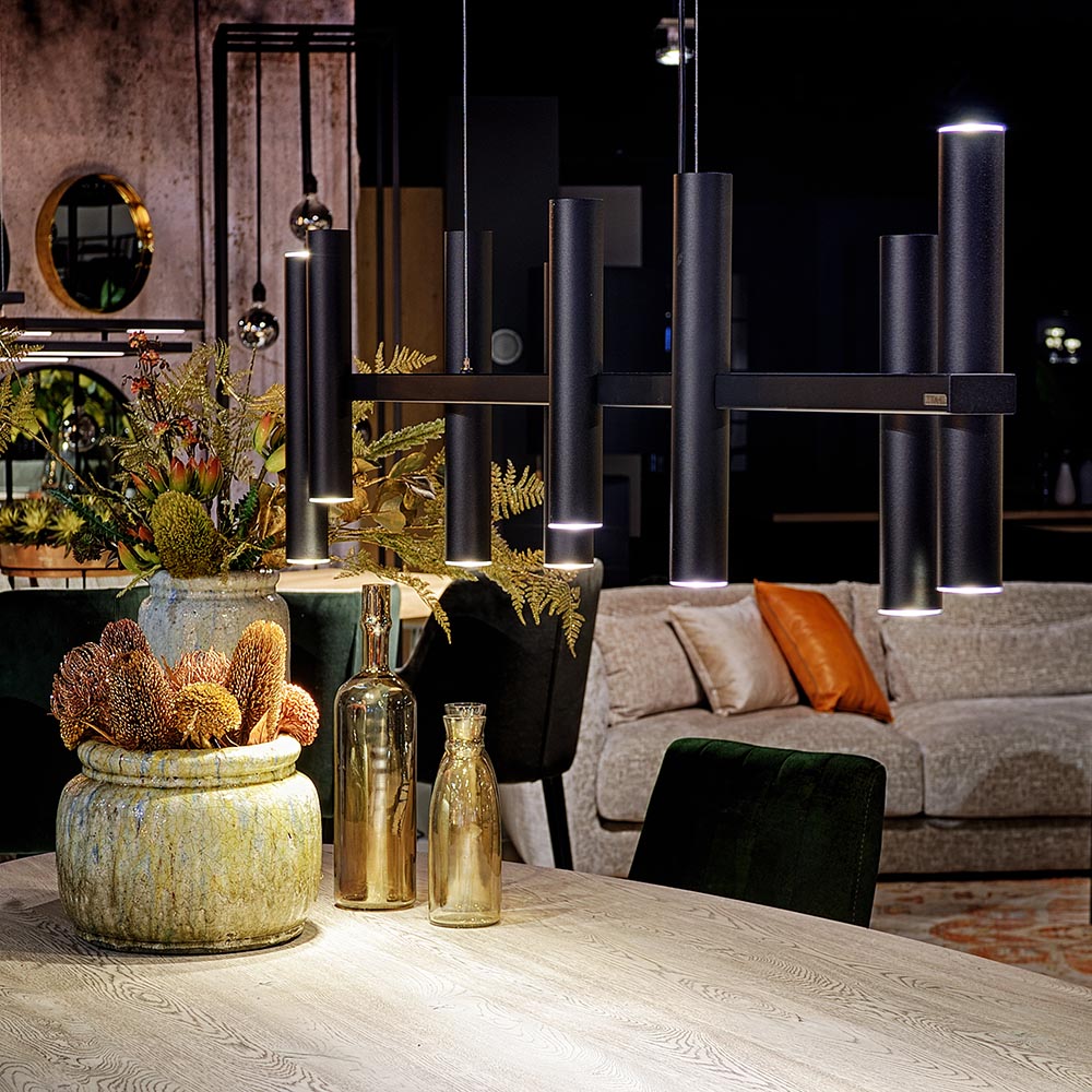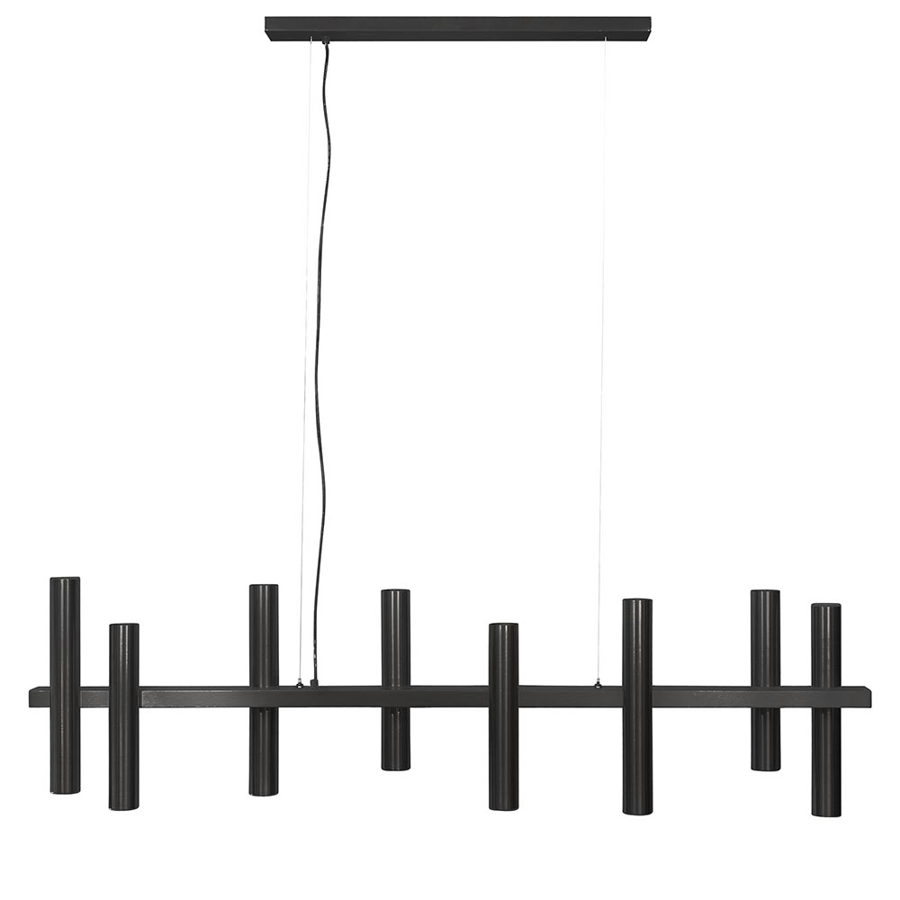 Een uniek design met een elegante, luxe uitstraling. Deze hanglamp is vervaardigd uit metaal en afgewerkt met een mat zwarte finish. De matte afwerking geeft deze hanglamp een stoere en stijlvolle look die mooi is te combineren in diverse woonstijlen. De hanglamp lijkt een 8-lichts te zijn, maar is voorzien van 10 lichtpunten. De 8 cilinders schijnen naar beneden, maar de buitenste twee hebben ook een lichtpunt aan de bovenzijde. Zo zorgt de grote hanglamp dus ook voor indirecte lichtverspreiding in de ruimte. Ideaal voor boven een grote eettafel of een vergadertafel in een kantoor. Waar de lamp ook hangt, met zijn unieke design is het ongetwijfeld de eyecatcher in de ruimte.