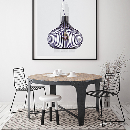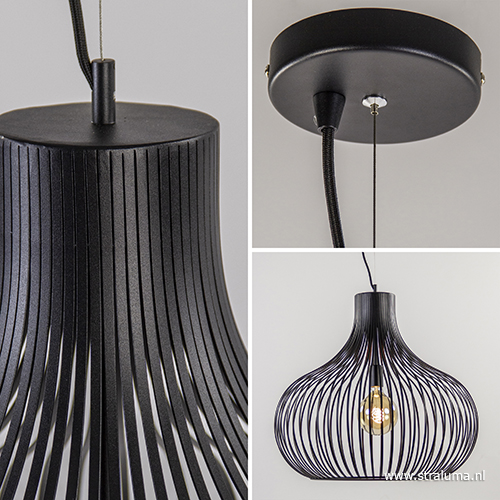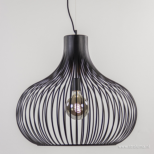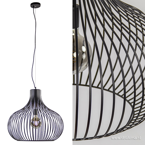 Wat een eye-catcher is dit! Deze grote hanglamp met een kap van wel 60 cm valt direct op in huis. De ronde hanglamp past mooi boven een grote eettafel, zowel rechthoekig als rond. De draadlamp heeft een metalen frame van meerdere speilen die bovenaan de kap allemaal samenkomen. De mat zwarte kap hangt aan een staaldraad en heeft zwart stofomwonden snoer, beide zijn in hoogte te verstellen. De hanglamp wordt aan het plafond opgehangen met een ronde bevestiging. Doordat beide snoeren veel lengte hebben past de lamp prima in een ruimte met een hoog plafond.