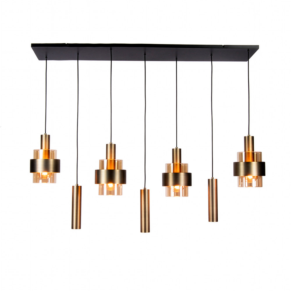 / Lampen / Eettafellampen / Hanglamp balk Marrone 7L in brons kleur met amber glas