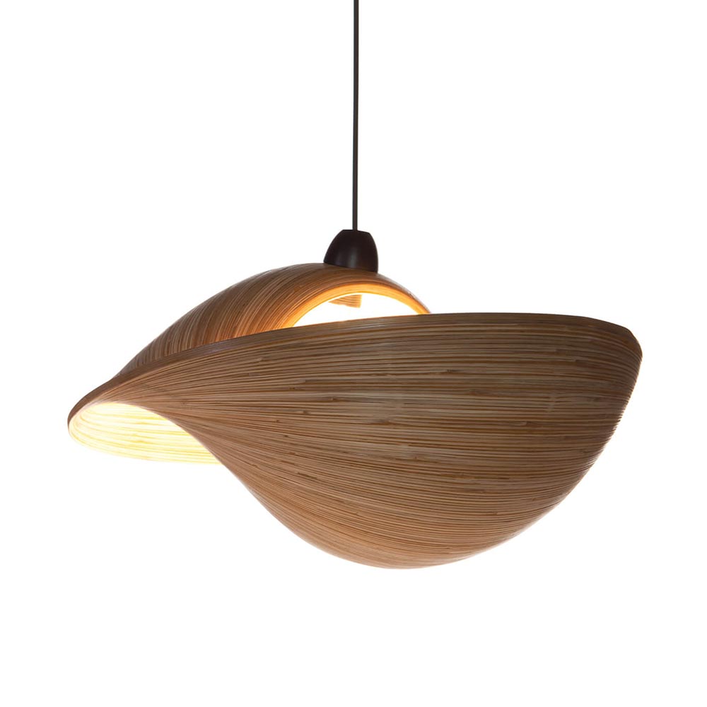 Een uniek design dat een echte eye-catcher is in het interieur. De hanglamp is gemaakt van bamboe en is uitgevoerd in de vorm van een schelp. Doordat de bamboe kap aan twee kanten open is kan het licht mooie verspreiden. Het bamboe heeft een warme sfeervolle tint dat mooi is toe te passen in diverse woonstijlen. Door de grootte van de lamp is deze geschik voor boven de eettafel of in de slaapkamer. De bamboe kap hangt aan een zwart snoer en is naar wens in te korten.