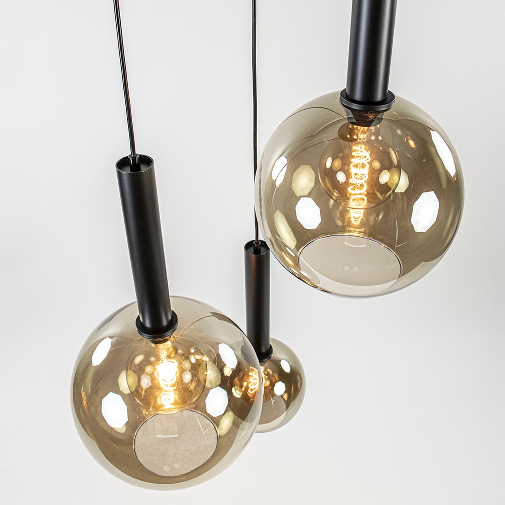 Deze luxe hanglamp is een mooie toevoeging aan het interieur. Prachtig boven een ronde eettafel, in de woonkamer of een ruimte met een hoog plafond. De 3-lichts hanglamp heeft een hoogte van 230 cm en is naar wens te verstellen. De 3 smoke glazen bollen, verdeeld over 3 maten, zijn naar wens op hoogte te hangen. De smoke glazen bollen worden bevestigd op een cilinder vormige pendel die is uitgevoerd in het mat zwart. Deze combinatie geeft de pendellamp een chique luxe uitstraling die mooi combineert in diverse woonstijlen als chic, luxe, strak klassiek en retro. De 3-lichts ronde hanglamp is dimbaar middels een externe dimmer (exclusief) en wordt geleverd zonder lichtbronnen.