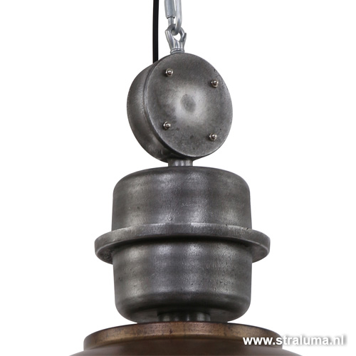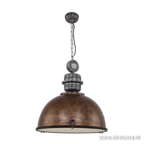 Een echte industriële vormgeving heeft deze XXL hanglamp ‘Bikkel’. Door de bruine kleur krijgt hij ook iets landeljks. Een combinatie die we steeds meer gaan zien. Diverse stijlen kunnen met elkaar gecombineerd worden en kleur en vormgeving maken de lamp. De Bikkel is een flinke hanglamp met een doorsnede van 52 cm, uitstekend voor boven de eettafel. De robuuste ketting kunt u verstellen waardoor hij ook korter opgehangen kan worden. Onderaan de bruine hanglamp zit een glasplaat bevestigd, dit heeft twee voordelen: u kijkt niet in de lichtbron als u aan tafel zit en daarnaast wordt het licht mooi diffuus verspreid. Echt een blikvanger in uw interieur waar niemand omheen kan.