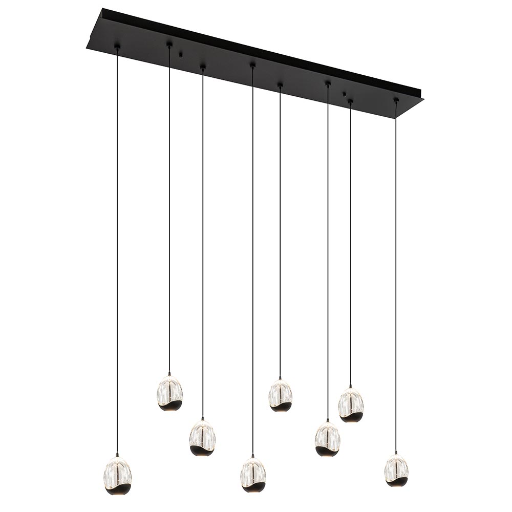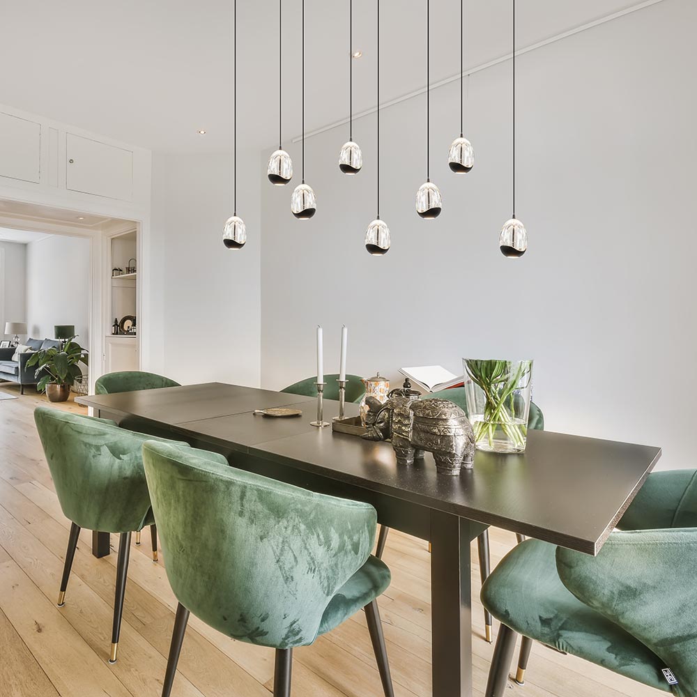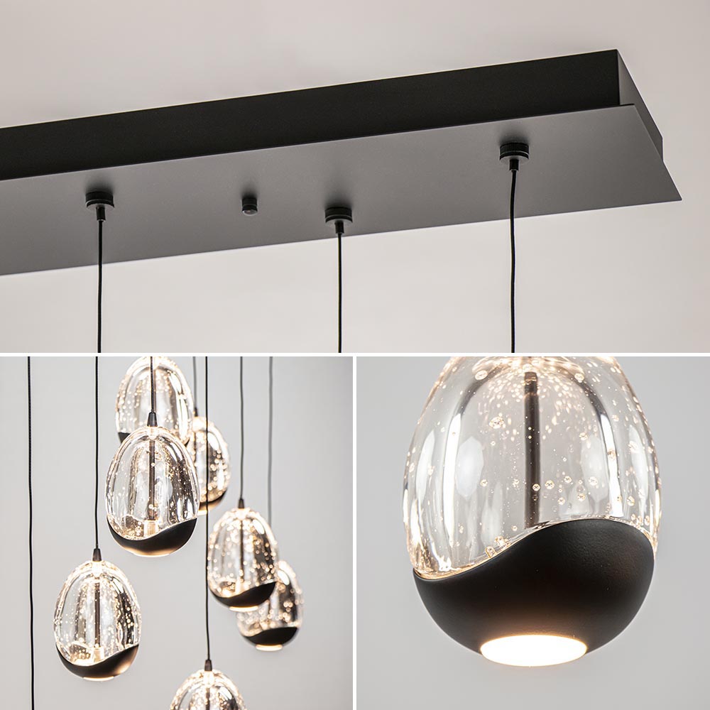 Eieren voor uw geld? Dat kan nu letterlijk met deze moderne hanglamp. De kappen zijn gevormd als een ei en voorzien van LED verlichting. De kap is deels van massief helder glas en deels van metaal dat is uitgevoerd in het mat zwart. Dit geeft de kap een moderne luxe uitstraling. Het glas is voorzien van belletjes wat een mooi effect geeft wanneer de lamp wordt ingeschakeld. De verlichting geeft direct licht naar beneden dmv de spot onderop het ei, en daarnaast ook indirect licht door het licht binnenin het ei. De 8 kappen zijn gemakkelijk naar wens op hoogte te hangen dmv een trekontlaster. De 8-lichts hanglamp wordt opgehangen met een mat zwarte balk van 115 cm.