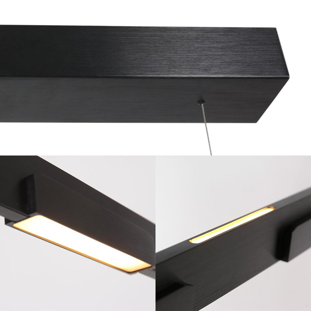 – Afmetingen: 120 x 9.5 x 130 cm – Kap: 120 x 9.5 cm – Plafondbevestiging: 50 x 9.5 x 6 cm – Metaal, mat zwart – 2700 Kelvin – 4200 Lumen – 6 Watt – Geïntegreerd LED (7 stuks) – Dimbaar (exclusief)