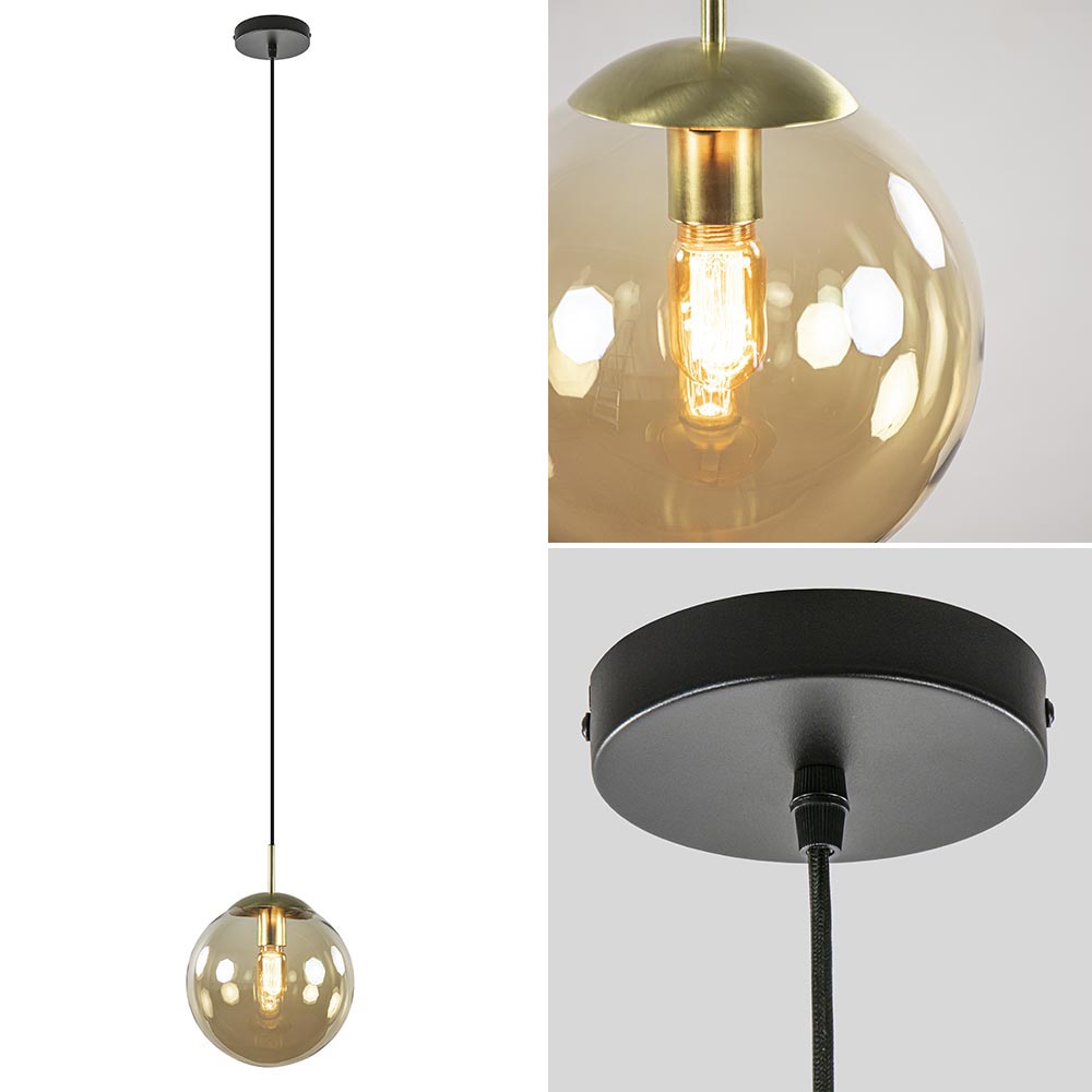 – afm: Ø25×165 cm – bevestiging: Ø12×2,5 cm – kap: Ø25 cm – amber glas – metaal, messing/zwart – in hoogte verstelbaar – exclusief lichtbron (E27) – dimbaar (exclusief)