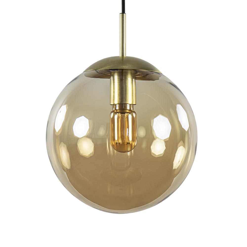 Een prachtige toevoeging voor een hal, woonkamer of slaapkamer. Deze hanglamp bol zorgt in ieder geval voor sfeer, waar deze ook hangt. De hanglamp bestaat uit een amber glazen bol die is afgewerkt met een messing kap en fitting. Het ronde glas hangt aan een zwart stof omwonden snoer die naar wens is in te korten. De maximale hoogte van de lamp is 165 cm. De hanglamp met amber glazen bol wordt geleverd zonder lichtbron (E27).