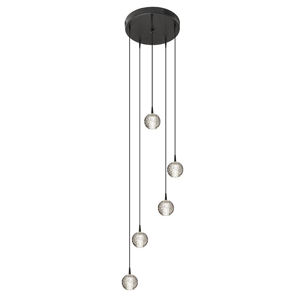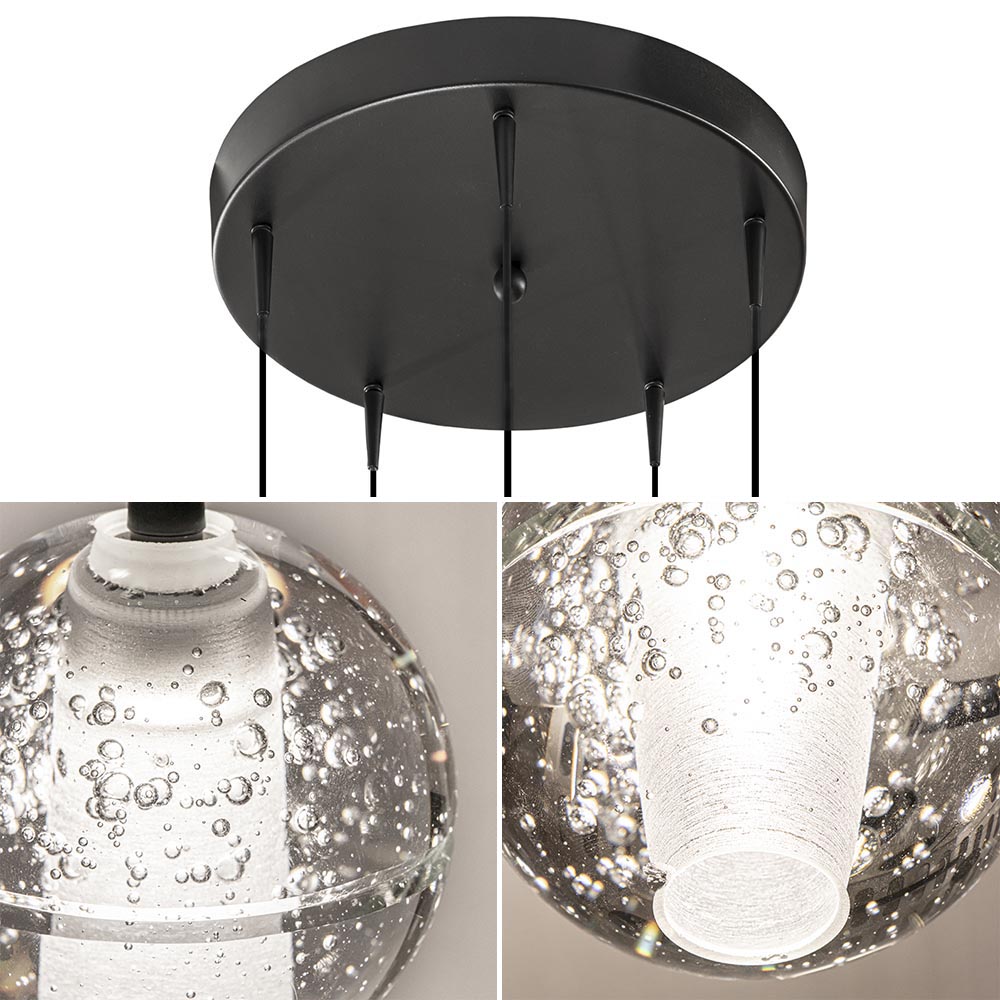 Prachtig voor in een ruimte met een hoog plafond, deze ronde 5-lichts hanglamp. De ronde hanglamp past perfect boven een eet- of salontafel of in een hal. De glazen bollen zijn voorzien van een bubbel effect wat leuk oplicht wanneer de lamp wordt ingeschakeld. Binnenin de bol is het glas mat zodat er niet direct in de lichtbron kan worden gekeken. Dit is een LED lichtpunt die met 450 lumen per bol een flinke opbrengst geeft. Door middel van een externe dimmer (exclusief) zou de lamp gedimt kunnen worden. De helder glazen bollen hangen aan zwarte snoeren welke naar wens zijn in te korten. De maximale hoogte van de lamp is 210 cm. De moderne hanglamp is een fijne sfeermaker met een mooi effect.