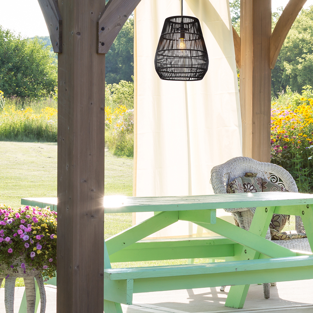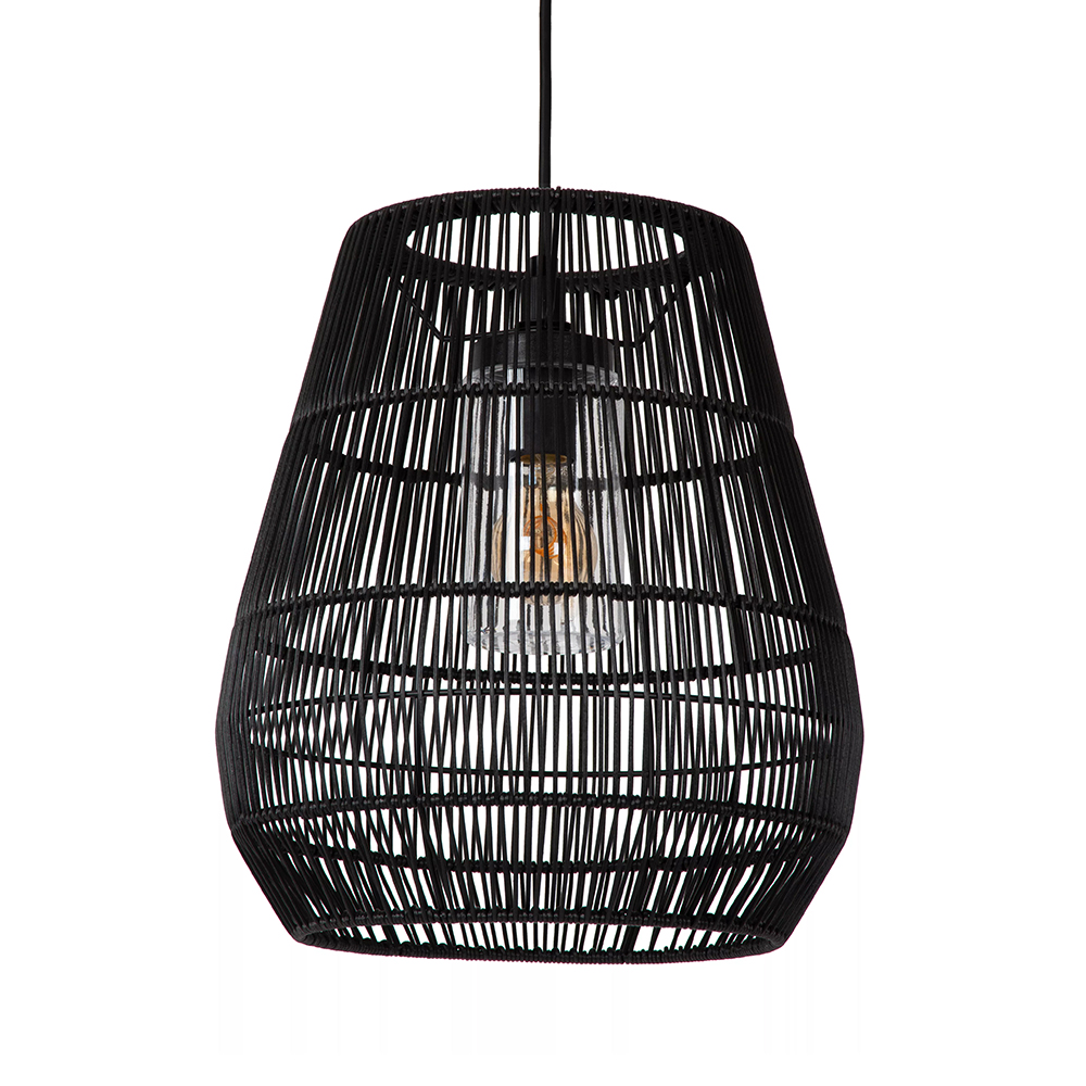 Deze rotan buitenlamp maakt het terras of de overkapping net even wat gezelliger. De hanglamp is IP44 goedgekeurd en kan wel wat weersomstandigheden hebben. De kap is gemaakt van rotan en uitgevoerd in het zwart. Binnenin de kap is de fitting te vinden die is afgeschermd door een helder glazen kap. De buiten hanglamp is voorzien van een snoer met stekker en heeft een lengte van 350 cm. Door middel van het meegeleverde haakje kunt u de lamp ophangen waar u wenst en genieten van extra sfeer en gezelligheid tot in de late uurtjes.