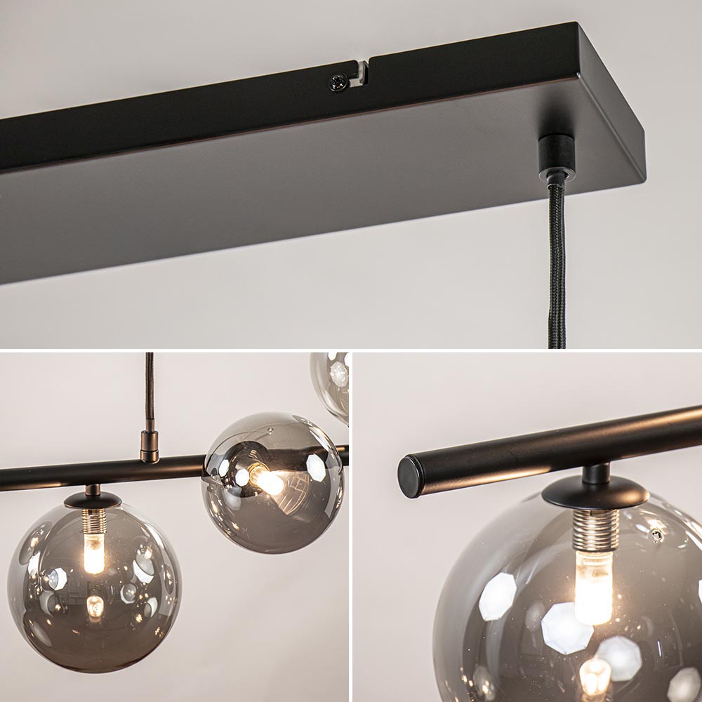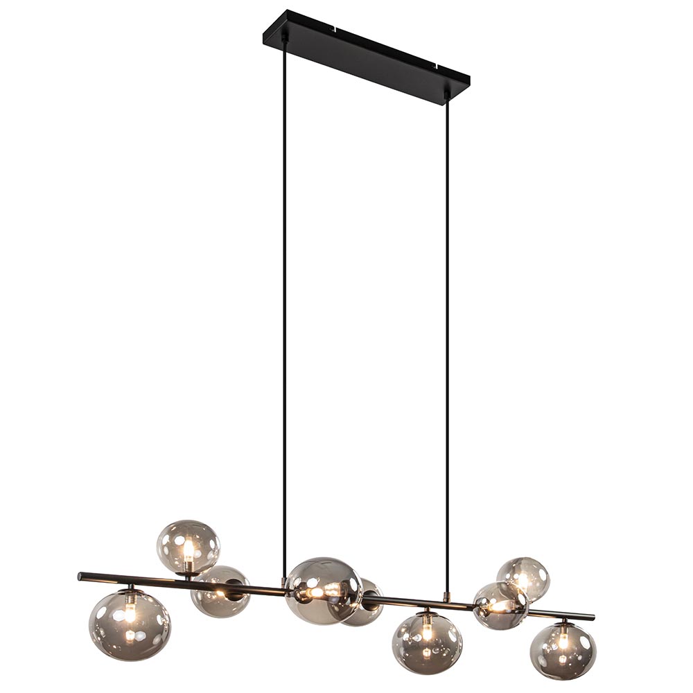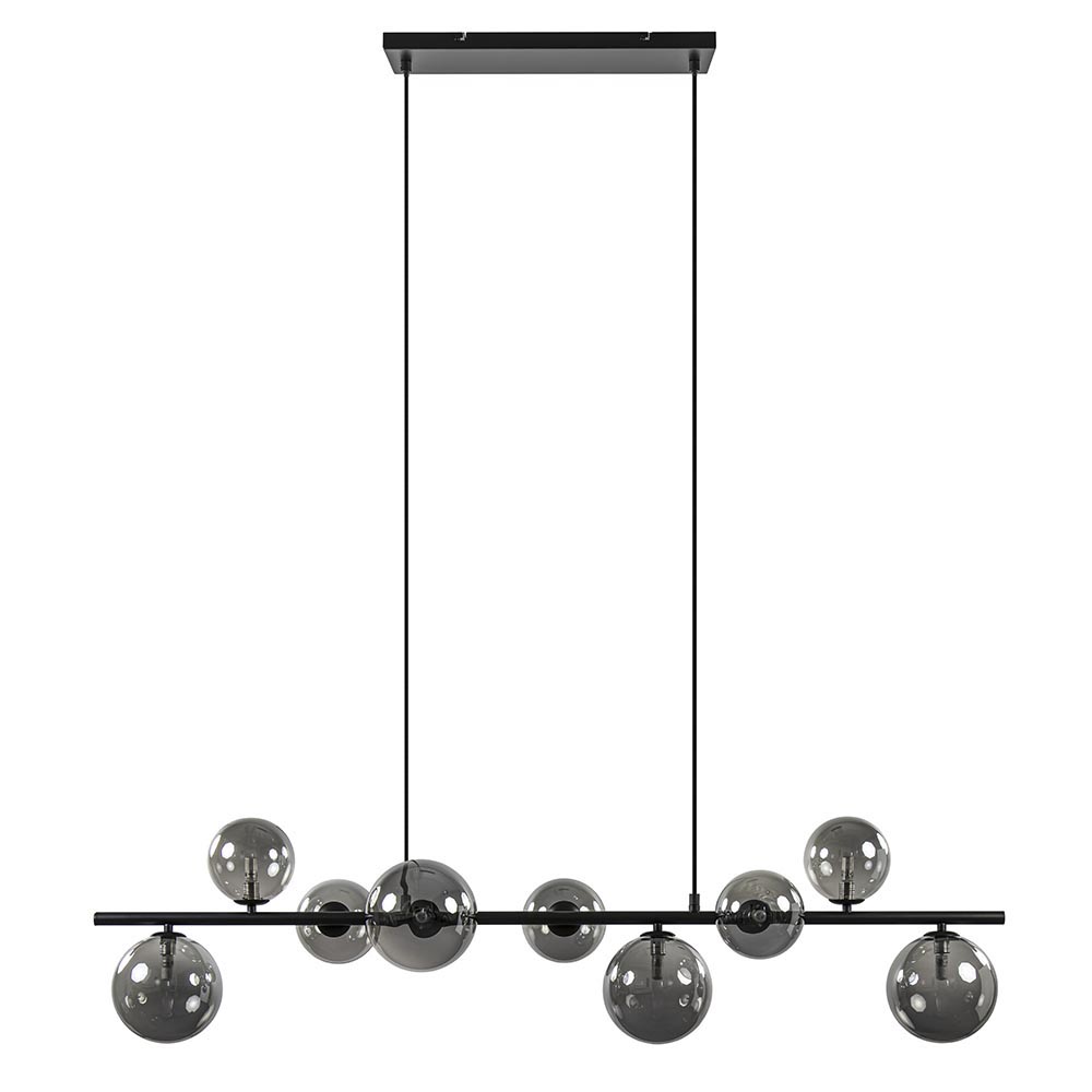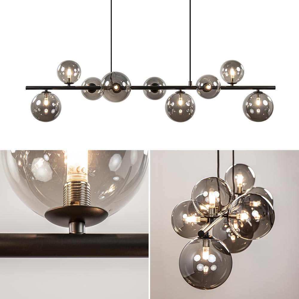 Deze chique hanglamp is mooi toe te passen in diverse woonstijlen, van klassiek tot hotel chic of retro. De hanglamp heeft een simplistisch design waarbij de aandacht mooi naar het glas gaat. Het armatuur bestaat uit een mat zwarte metalen stang die hangt aan 2 textiel snoeren. Deze zijn naar wens in te korten. De metalen stang is voorzien van 9 lichtpunten waar de smoke glazen bollen op worden gedraaid. Deze zijn voorzien van schroefdraad en hebben 2 afmetingen, 15 en 12 cm doorsnede. Het donkere glas geeft de lamp een luxe uitstraling en door de 2 afmetingen krijgt de lamp een mooie verhouding. De hanglamp staat prachtig boven een eettafel en is dimbaar middels een externe dimmer (exclusief). De lichtbronnen zijn exclusief.