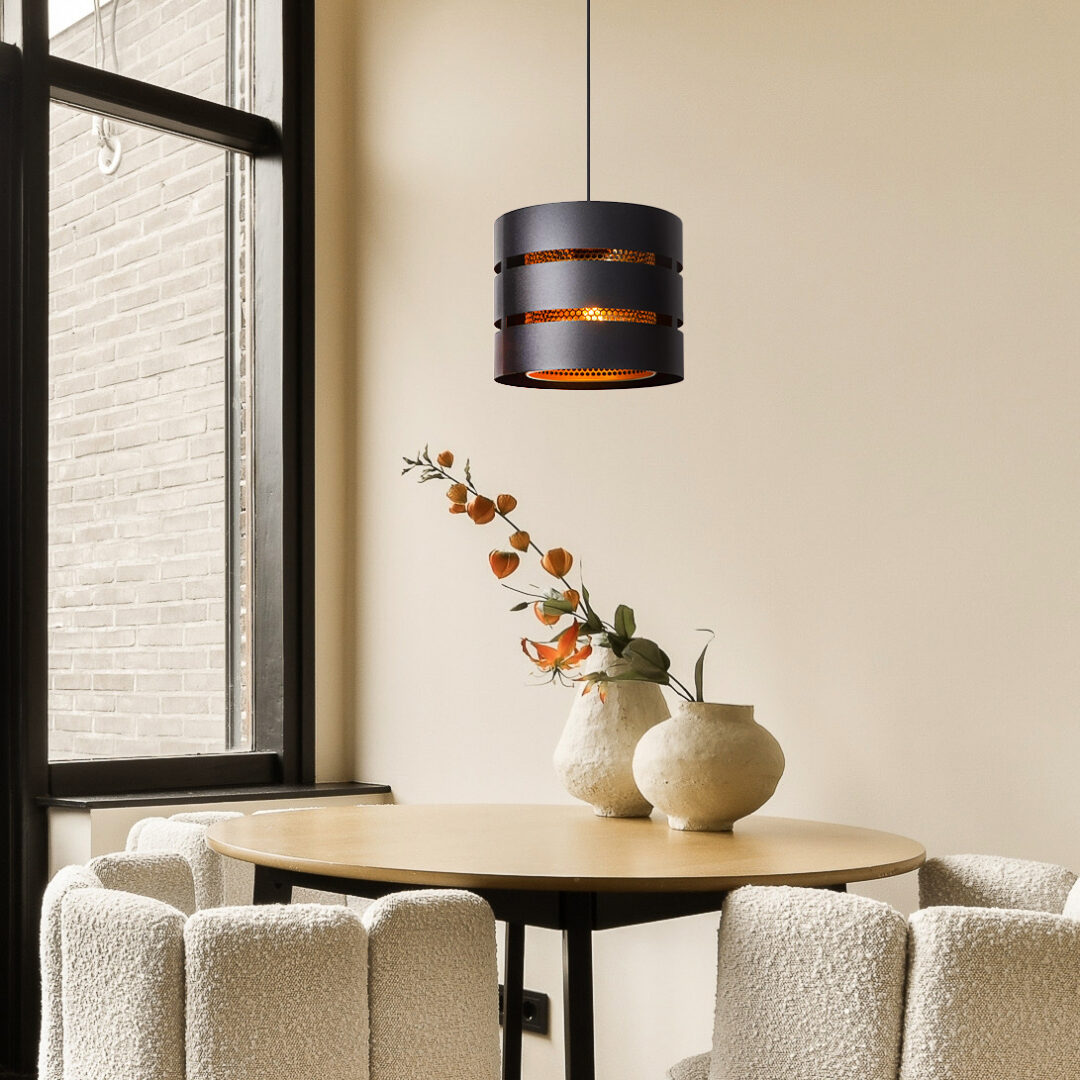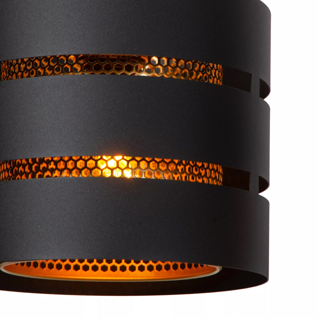 Een stoere hanglamp die z’n inspiratie vind in de natuur. De binnenste kap is namelijk geïnspireerd op de binnenzijde van een bijenkorf. Dit is dan ook uitgevoerd in het goud zodat de lamp een warme gloed afgeeft aan het interieur. De ronde hanglamp is volledig gemaakt van metaal en heeft een mat zwarte buitenkap. De combinatie van het zwart en goud maakt de lamp prima geschikt voor diverse woonstijlen. De hanglamp wordt geleverd zonder lichtbron en is dimbaar middels een externe dimmer (exclusief). Door z’n grootte is de hanglamp toepasbaar in een ruimte als de hal, slaapkamer of zelfs het toilet.