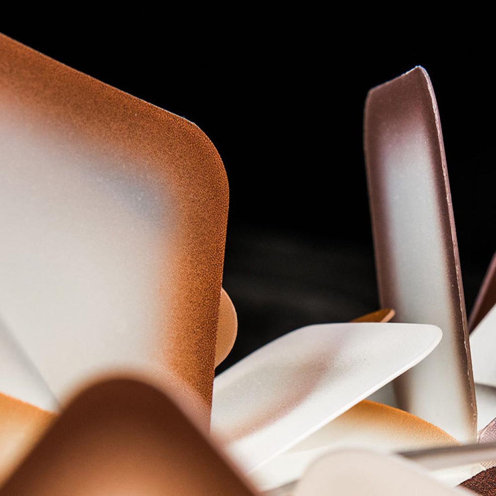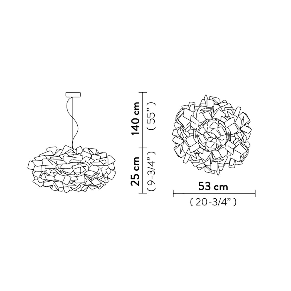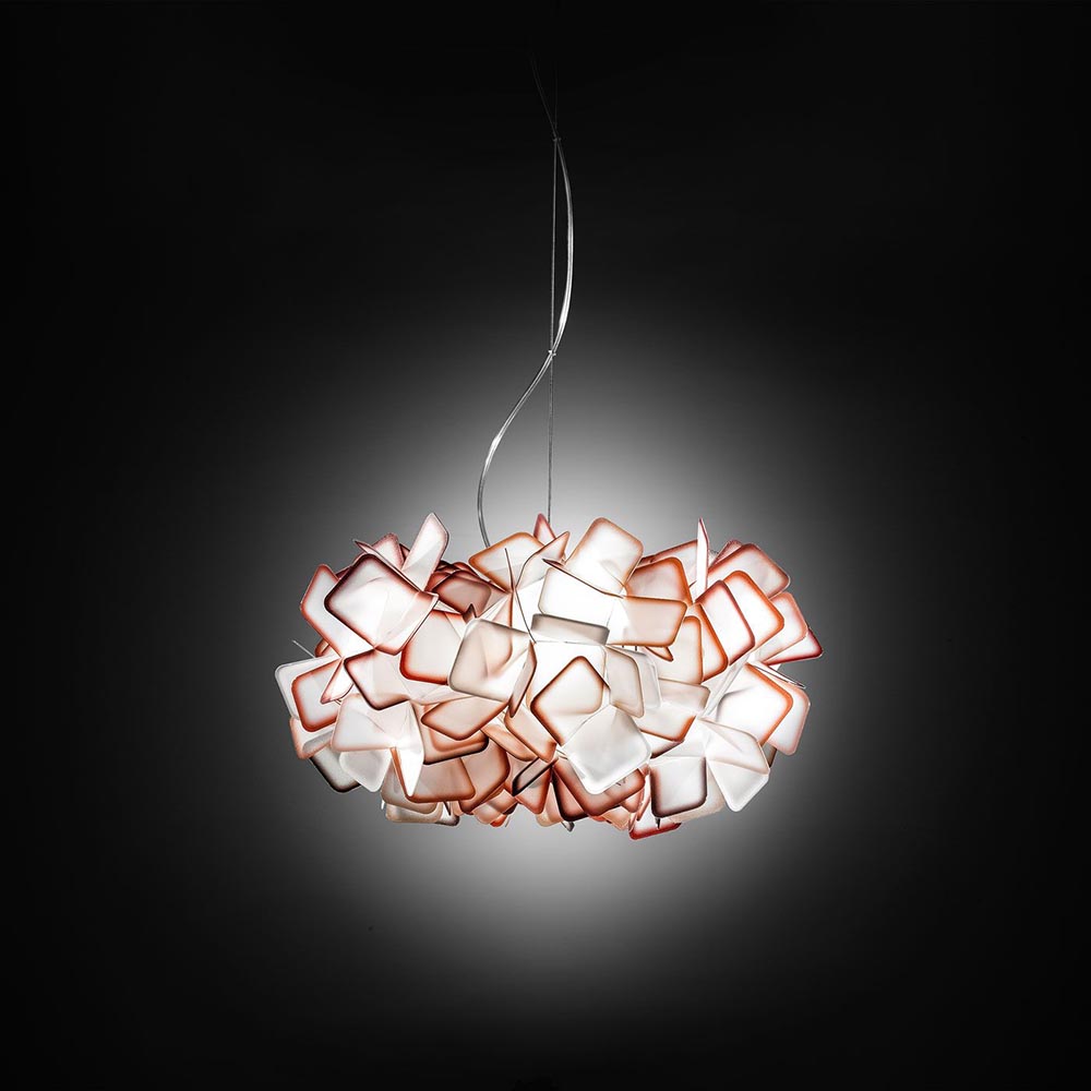 Prachtig Italiaans design en vervaardigd van hoogwaardig kunststof. Deze prachtige design hanglamp is als een wolk van licht. Hij neemt bezit van de ruimte, en geeft deze een heel nieuw karakter. De elementen lijken volledig willekeurig samegesteld, maar volgen een zeer precieze compositie. Deze sprankelende design lamp heeft een mooie balans van transparant en semi-transparant, in een oranje kleur. De lamp hangt met een transparant snoer en staalkabel aan de witte plafondbevestiging.
