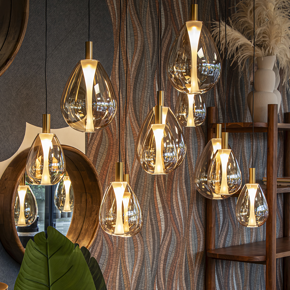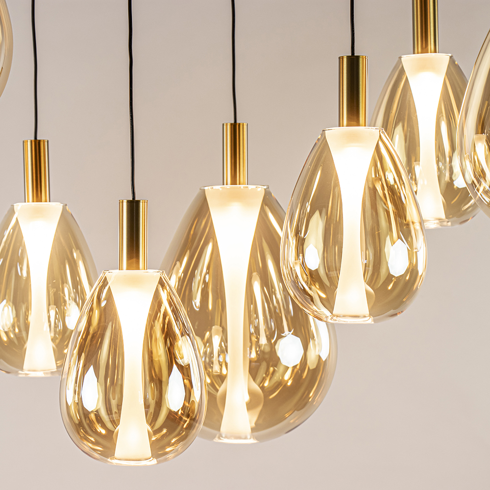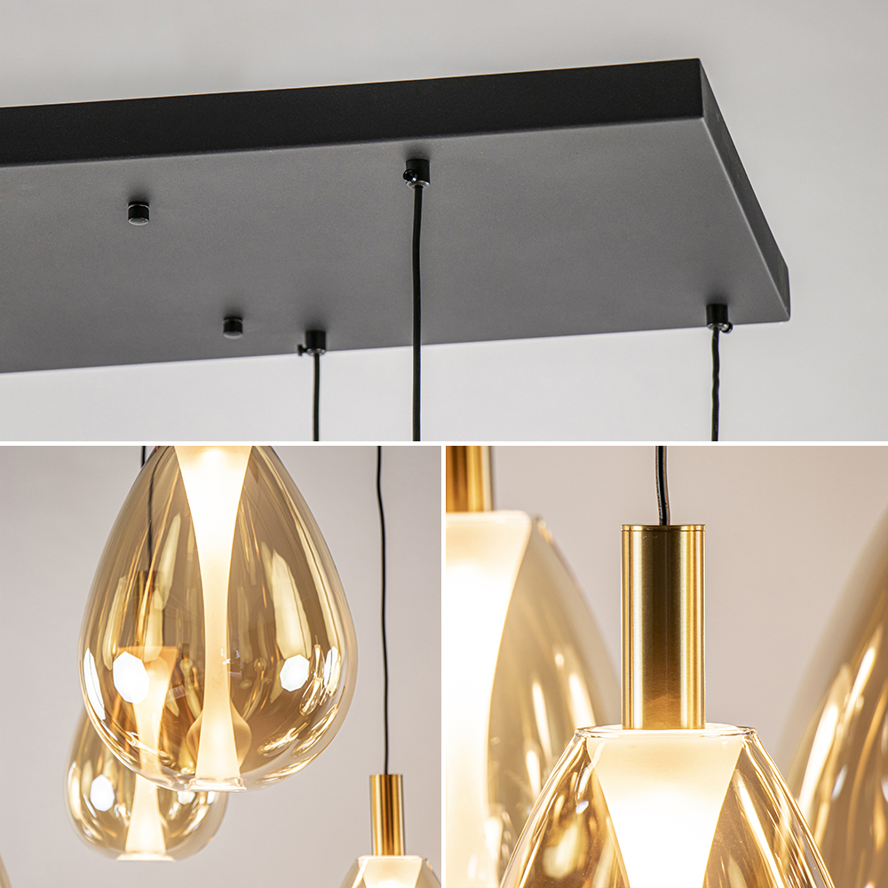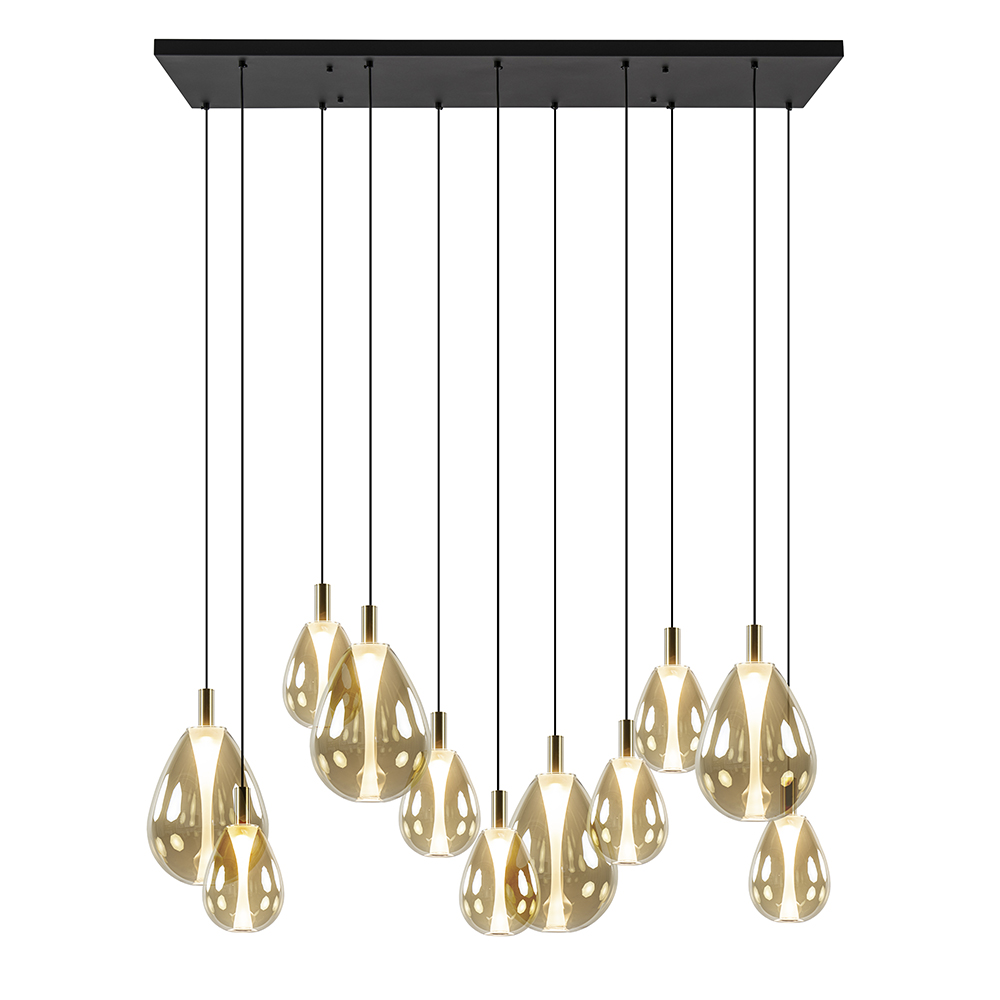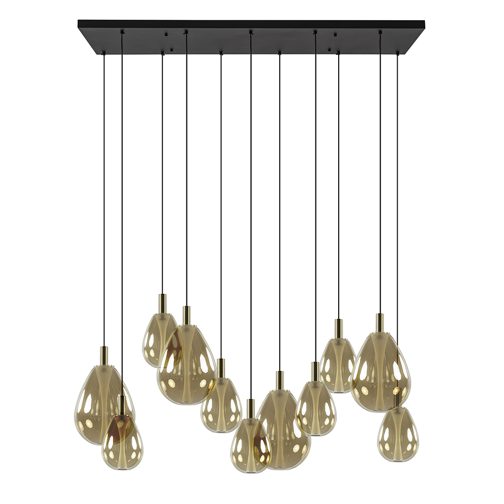 Een echte wauw-factor voor boven de eettafel. Deze luxe 11-lichts hanglamp straalt een en al luxe en elegantie uit. De hanglamp heeft een mat zwart armatuur dat is gecombineerd met amber glazen kappen. Dit geeft de hanglamp klassieke en elegante uitstraling. Dit wordt versterkt door het matte binnenglas dat oplicht wanneer de lamp wordt ingeschakeld. Zo onstaat er een mooi effect in het glas. De grote hanglamp is voorzien van geïntegreerd LED en geeft met 2700 Kelvin een fijne en sfeervolle warm witte verlichting. Dit is dimbaar middels een externe dimmer (exclusief).