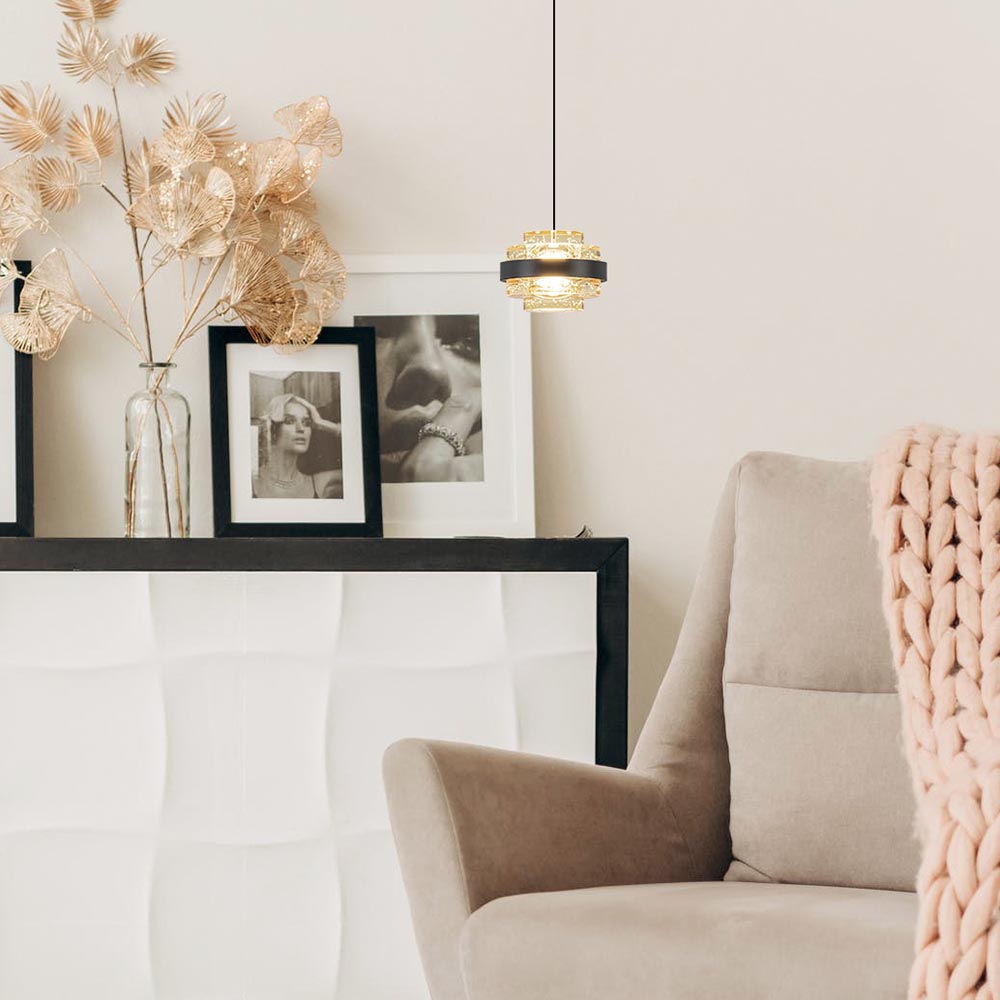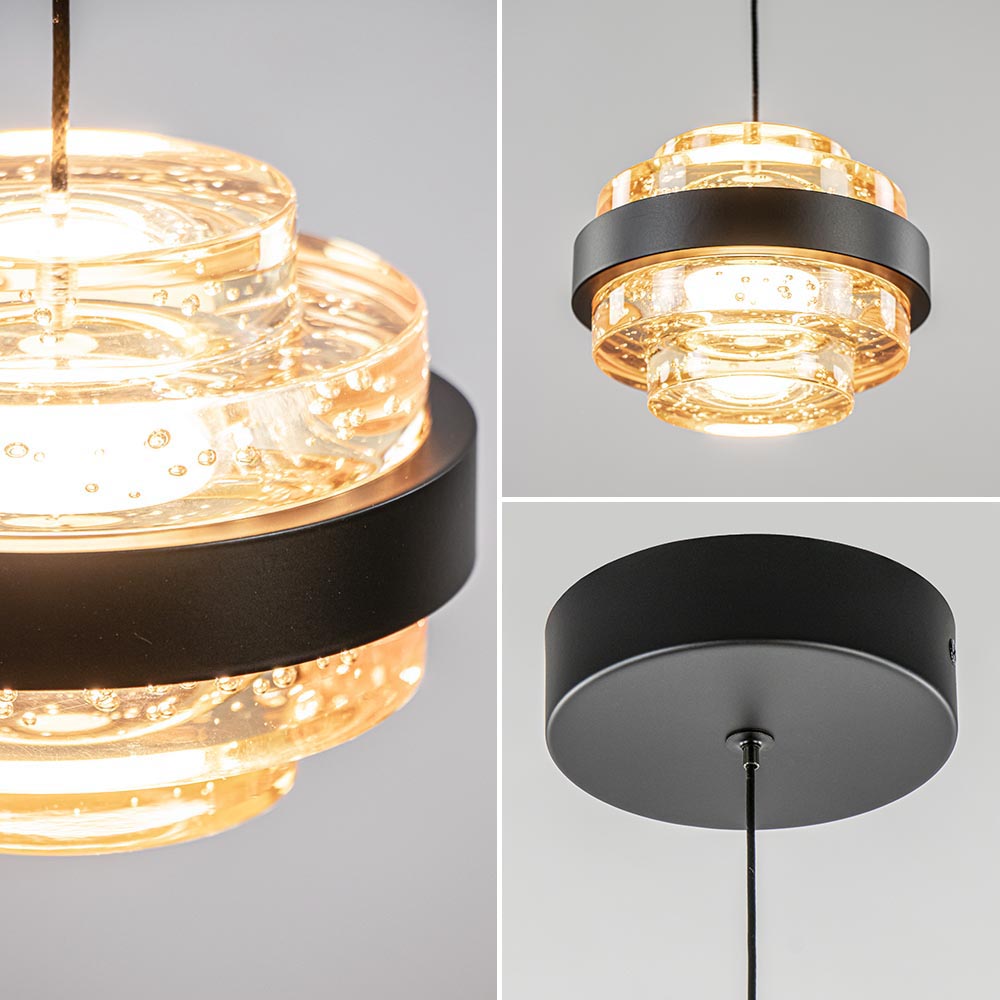 Een sfeervolle toevoeging voor boven een bijzettafel of boven een nachtkastje. De kap heeft een aparte vorm en is voorzien van LED verlichting. De kap is deels van massief glas en deels mat zwart metaal. Dit geeft de lamp een luxe uitstraling. Het glas is voorzien van luchtbelletjes wat de hanglamp een speels effect geeft. De hanglamp is gemakkelijk in te nemen mocht deze te hoog zijn. De hanglamp is dimbaar middels een externe LED dimmer (exclusief).
