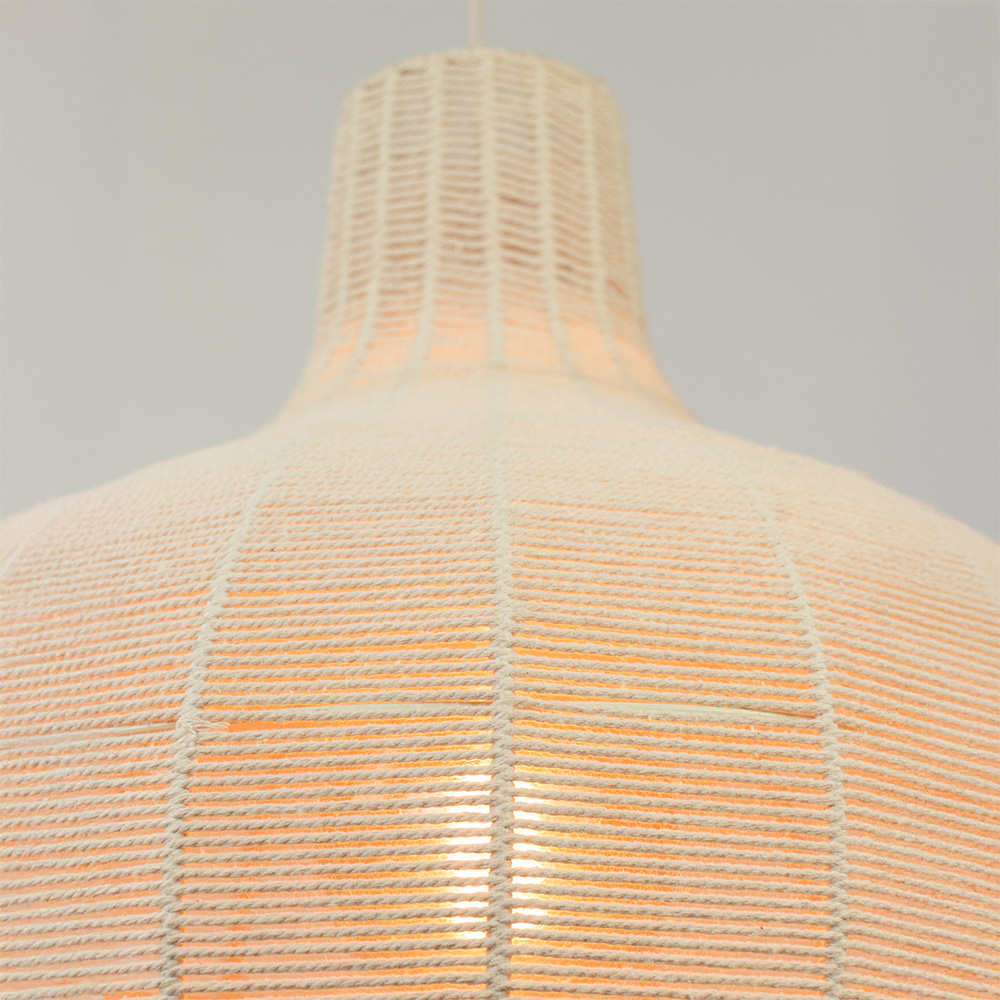 Specificaties: • Afmetingen: Ø50 x 190 cm (dxh, inclusief snoer) • Plafondbevestiging: Ø12 x 2,5 cm • Kap: Ø50 x 50,5 cm • Materiaal: Touw en metaal • Kleur: Zand/Crème • Gewicht: 1,8 kg • Fitting: 1x E27 (lichtbron niet inbegrepen) • Dimbaar: Ja, met een geschikte dimbare lichtbron en dimmer (niet inbegrepen).