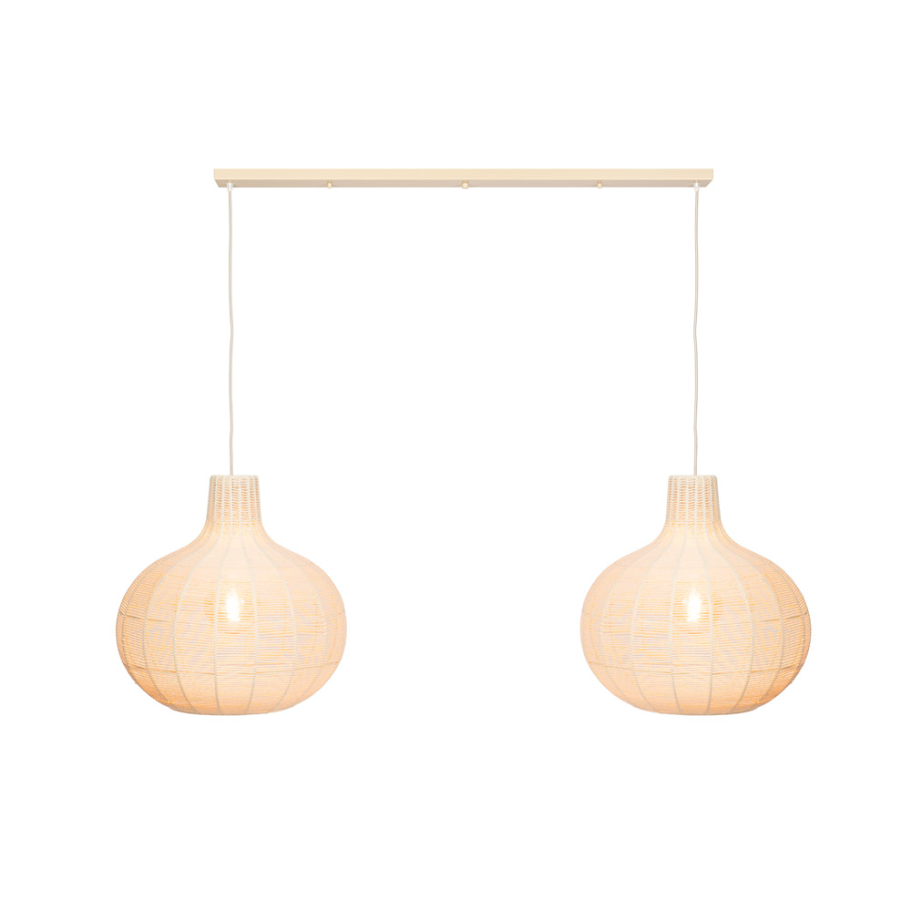 • Dubbele hanglamp met royale kappen van Ø50 cm • Luchtig geweven structuur voor warm, sfeervol licht • Japandi / Scandinavische / organische woonstijl • Ideaal boven een eettafel van ±160–200 cm • 2x E27 fitting (lichtbronnen niet inbegrepen) • Opstelling met balk van 110 cm voor mooie spreiding van het licht
