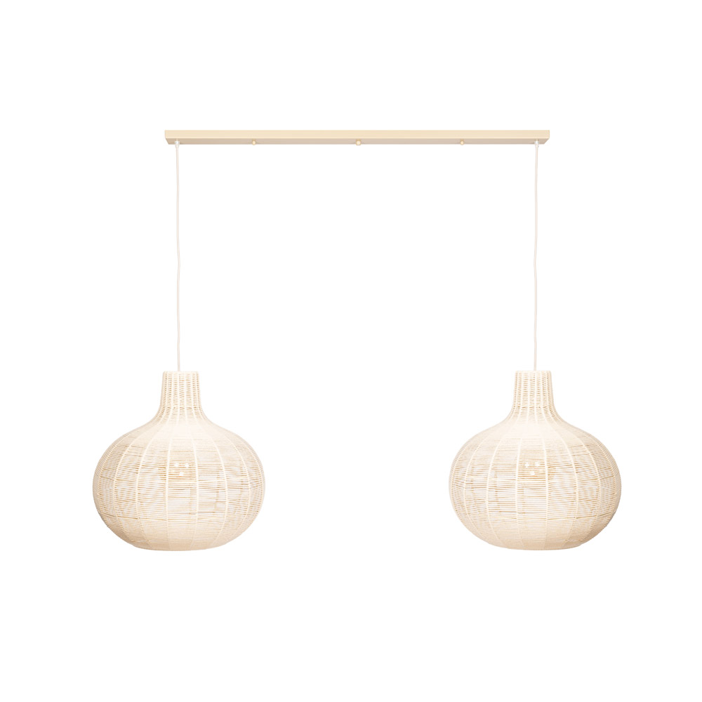 Specificaties: • Type: Hanglamp 2-lichts • Materiaal: Touw en metaal • Kleur: Naturel • Fitting: 2x E27 (lichtbronnen niet inbegrepen) • Dimbaar: Ja, via externe schakelaar en geschikte lichtbron (niet inbegrepen) • Afmetingen kap: Ø50 x H50,5 cm (per kap, 2x) • Afmetingen plafondbevestiging: L110 x B8 x H2,5 cm • Totale afmetingen lamp: L160 x B50 x H150 cm