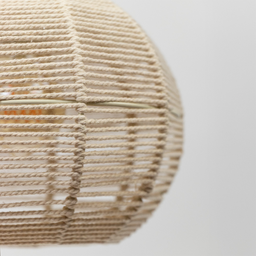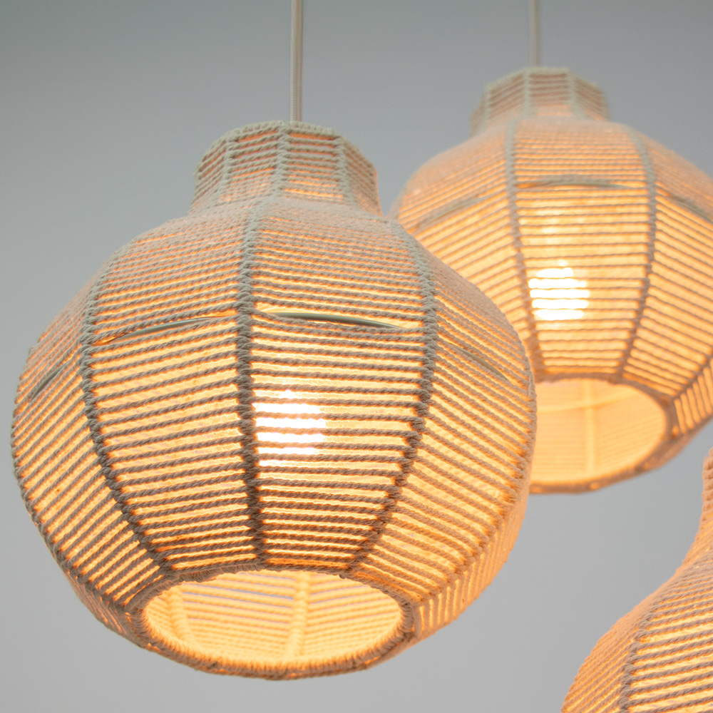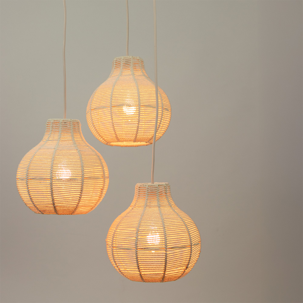 Specificaties: • Afmetingen: Ø40 x 180 cm (dxh, inclusief snoer) • Plafondbevestiging: Ø30 x 2,5 cm • Kap: Ø22 x 22,5 cm per stuk • Materiaal: Touw en metaal • Kleur: Zand/Crème • Gewicht: 2,2 kg • Fittingen: 3x E27 (lichtbronnen niet inbegrepen) • Dimbaar: Ja, met geschikte dimbare lichtbronnen en dimmer (niet inbegrepen).