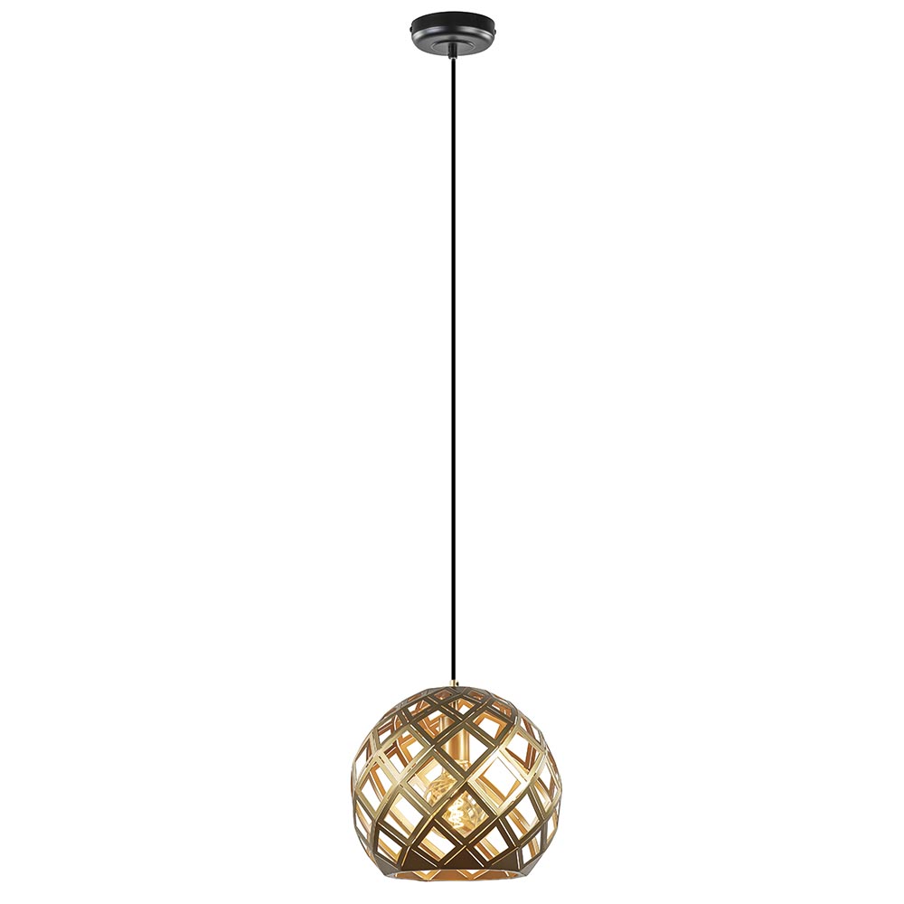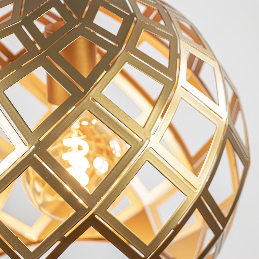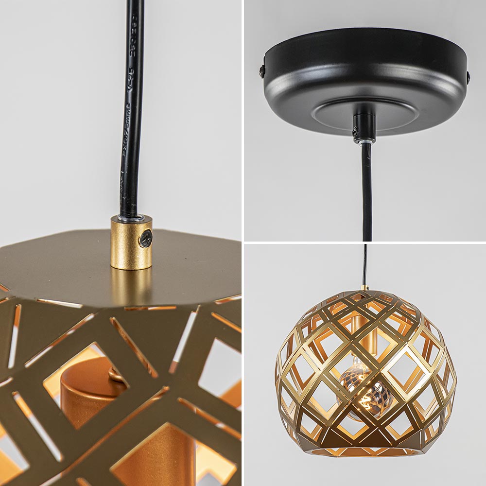 Deze kleine bol maakt het interieur helemaal af. De trendy hanglamp is gemaakt van metaal en afgewerkt met een mat gouden finish. Dit geeft de hanglamp bol een trendy look die mooi is toe te passen in diverse woonstijlen. Door z’n grootte past de lamp ook gemakkelijk in diverse ruimtes als de hal, toilet, woonkamer of slaapkamer. De ronde hanglamp heeft een open structuur waardoor deze een goede lichtdoorlating heeft. De lichtbron is dan ook mede sfeerbepalend. De gouden bol hangt aan een zwart snoer die naar wens is in te korten en wordt met een ronde bevestiging opgehangen.