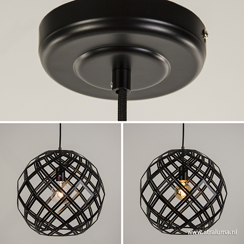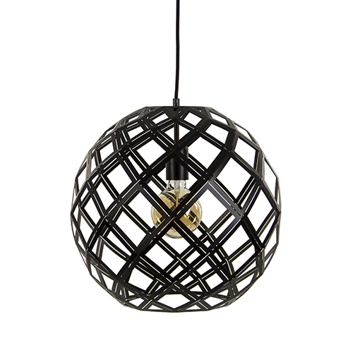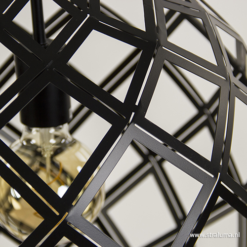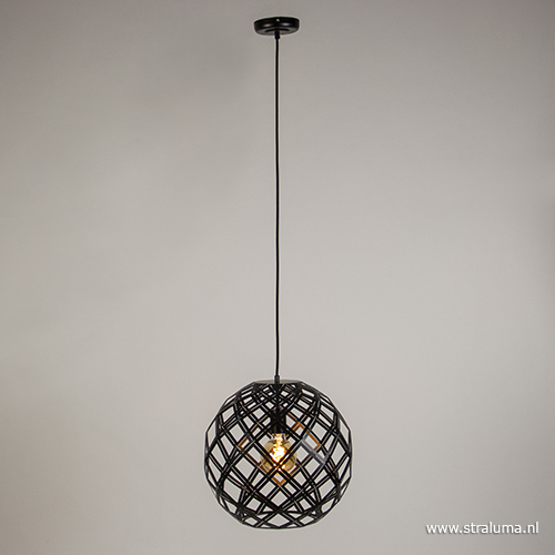 Deze metalen hanglamp geeft een Scandinavisch tintje aan het interieur. De mat zwarte hanglamp heeft door de open structuur een gevlochten effect wat de kap een speelse uitstraling geeft en een mooie lichtverdeling geeft. De ronde kap heeft een rechte onderkant met grote opening waardoor het makkelijk is om de lichtbron te vervangen. De bovenzijde van de kap is dicht en verloopt in het zwarte strijkijzersnoer.
