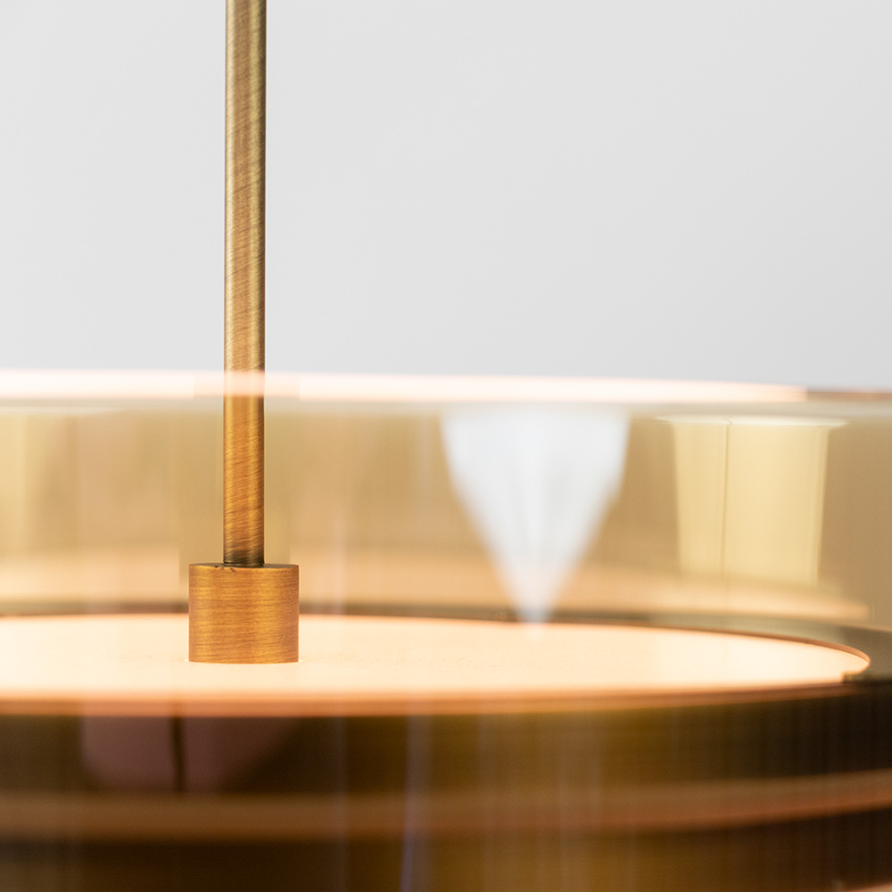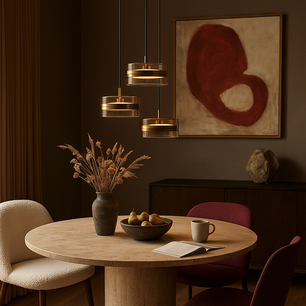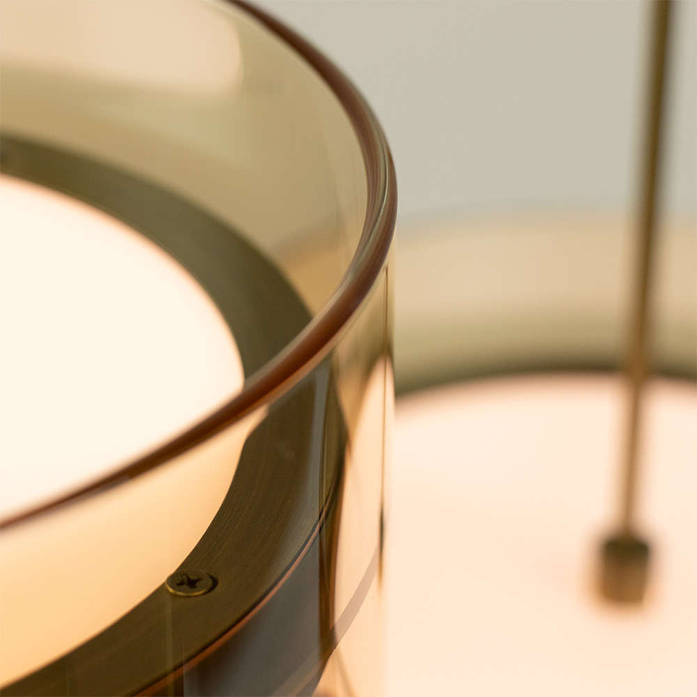 Deze hanglamp is een verfijnd statement in glas en messing. De cilindervormige kappen van licht getint amberglas zorgt voor een warme gloed, terwijl het bonze armatuur en de subtiele metalen details een chique retro-uitstraling geven. Dankzij de geïntegreerde LED-verlichting verspreidt deze lamp een zacht en sfeervol licht, ideaal boven een ronde eettafel of als blikvanger in de zithoek. Door de combinatie van transparantie en metaal krijgt de lamp een moderne en tijdloze look die moeiteloos past in zowel minimalistische als klassieke interieurs.