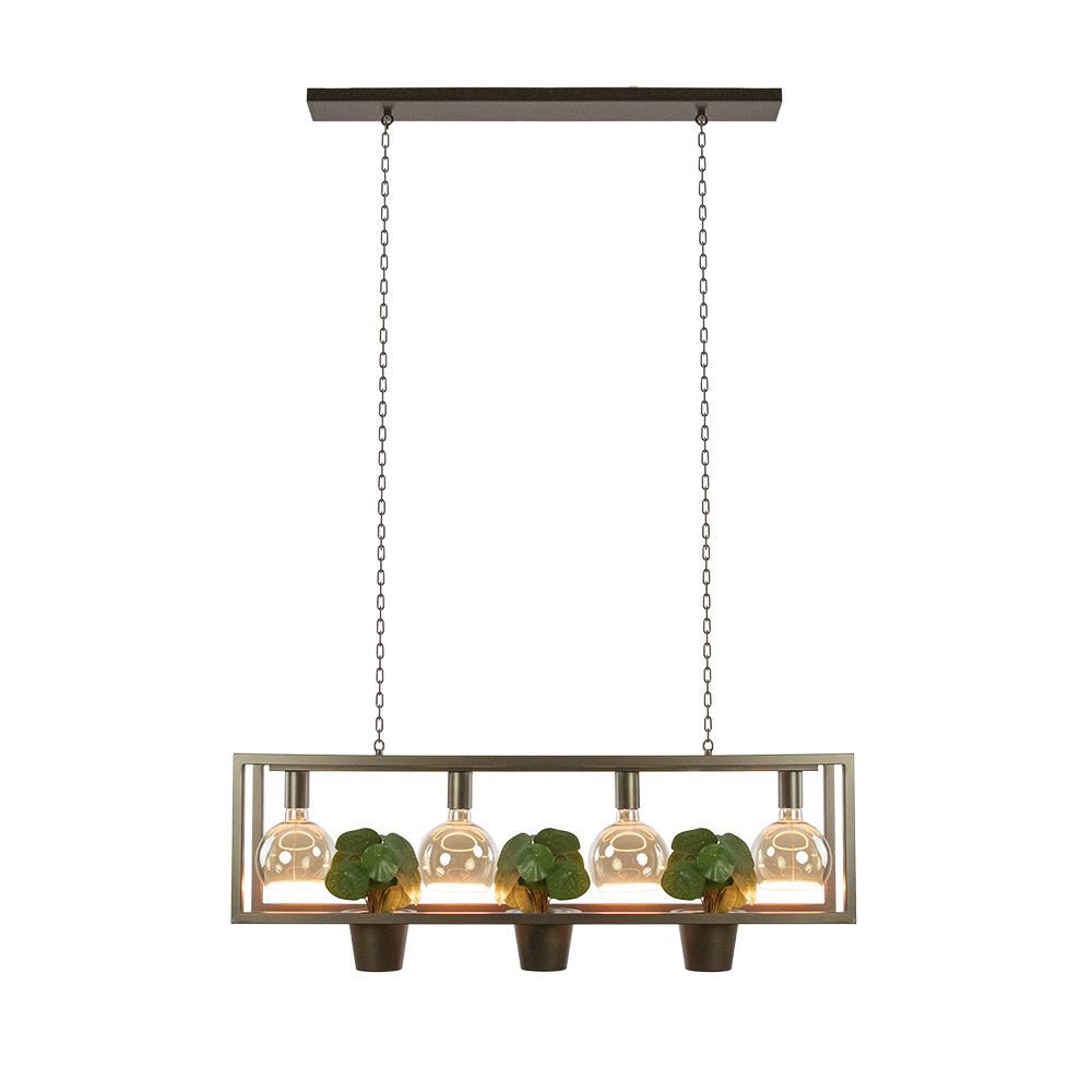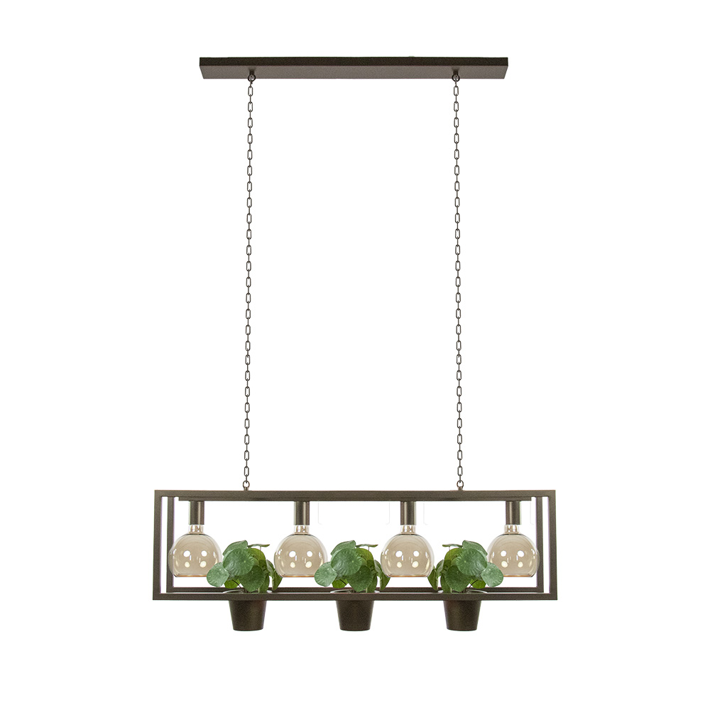 Plantenliefhebbers opgelet! Maak kennis met deze moderne hanglamp die de eetruimte zal verblijden. Deze leuke hanglamp combineert licht, design en groen op een prachtige manier. De lamp bestaat uit een metalen frame van 110 cm, waar 4 lichtbronnen en 3 bloempotten in worden geplaatst. Perfect om wat meer groen in huis te halen. Door de keuze in lichtbronnen en plantjes kun je de lamp helemaal eigen maken! Dit model verlicht dus niet alleen de eetruimte maar fleurt de boel ook nog eens op, maar het ontwerp van deze hanglamp zorgt ook voor een luxueuze en innovatieve sfeer in huis.