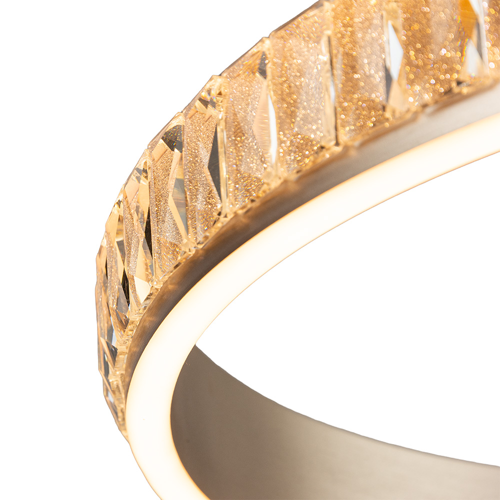 De combinatie van goudkleurige accenten, heldere imitatie kristalelementen en strakke vormen maakt deze lamp geschikt voor zowel klassieke als moderne interieurs. Dankzij de subtiele kabelophanging lijkt de lamp te zweven en komt het ontwerp volledig tot zijn recht.