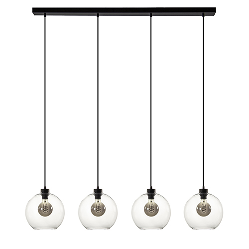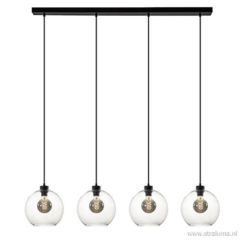 Glas hoeft niet saai te zijn, dat bewijst deze moderne 4-lichts hanglamp. De glazen bollen hebben een moderne uitstraling en met het zwarte snoer en plafondbalk krijgt de lamp ook een Scandinavisch tintje. De glazen bollen zijn van onder open en hangen aan een zwart stof omwonden snoer die in hoogte verstelbaar is.