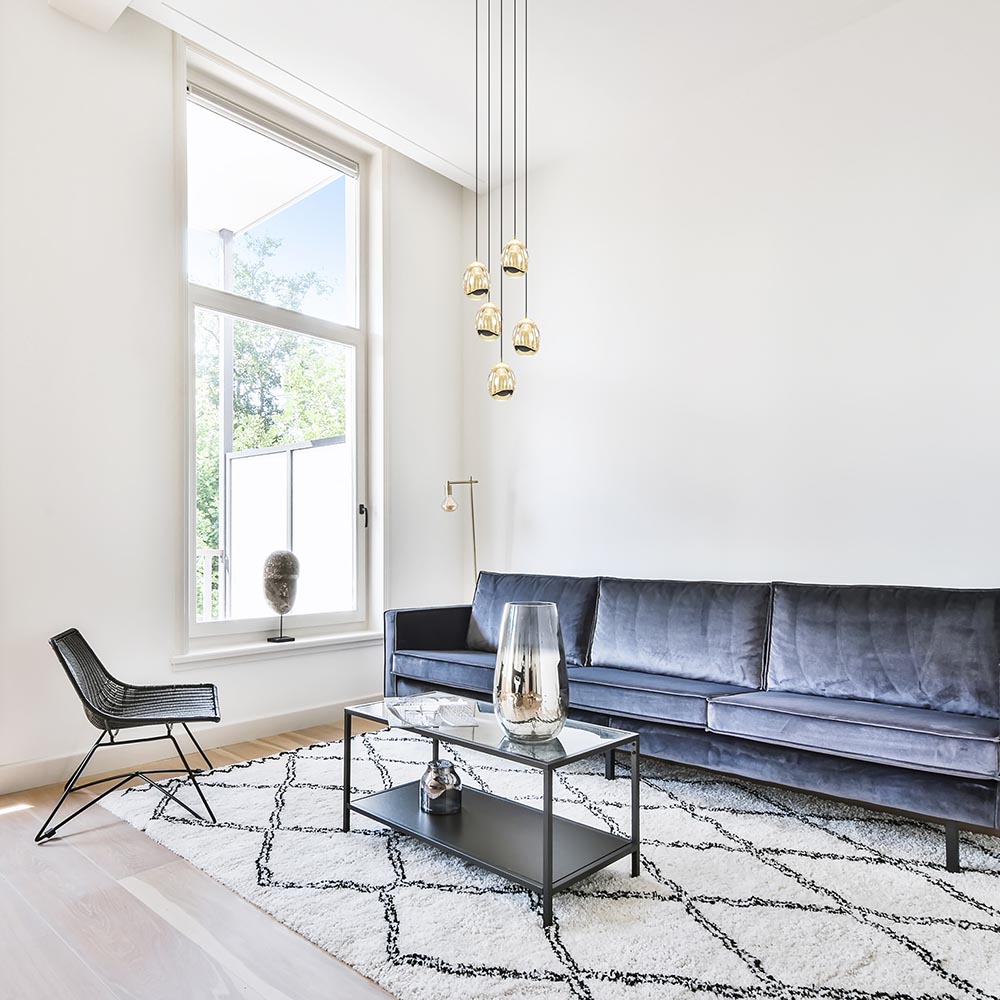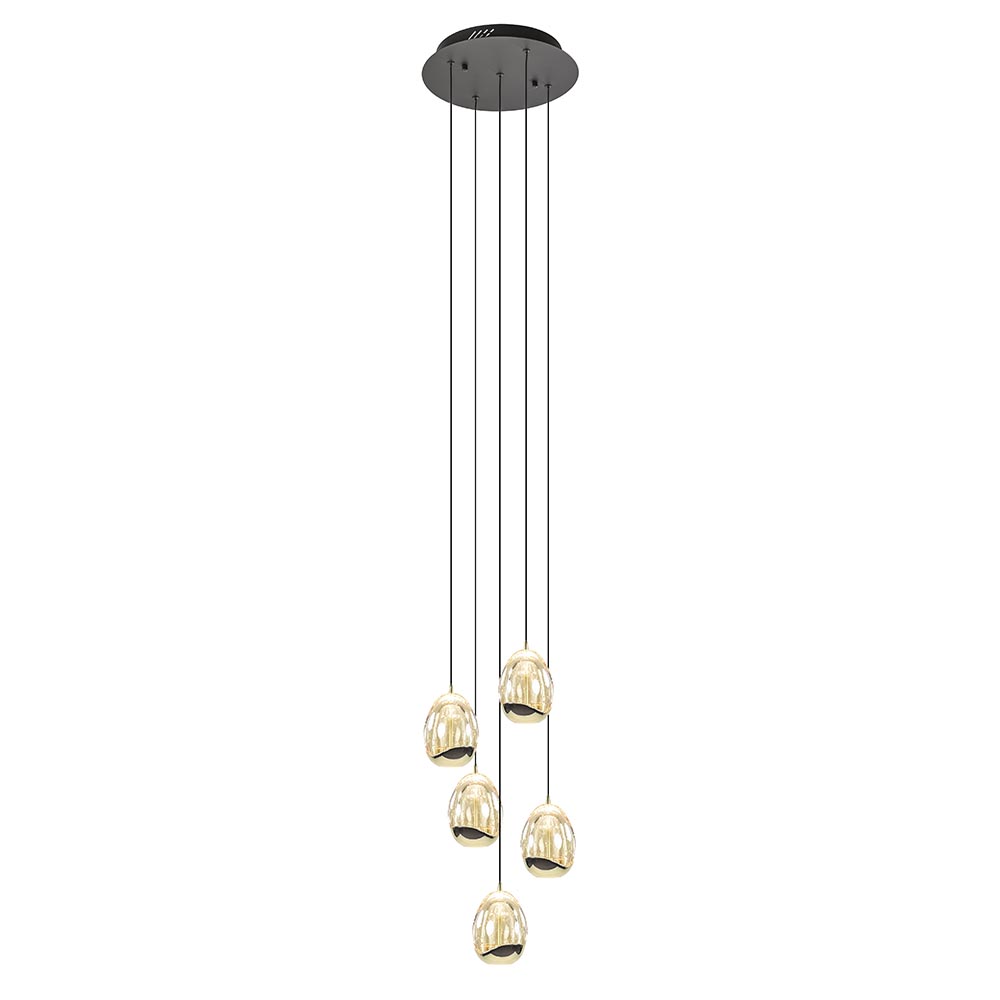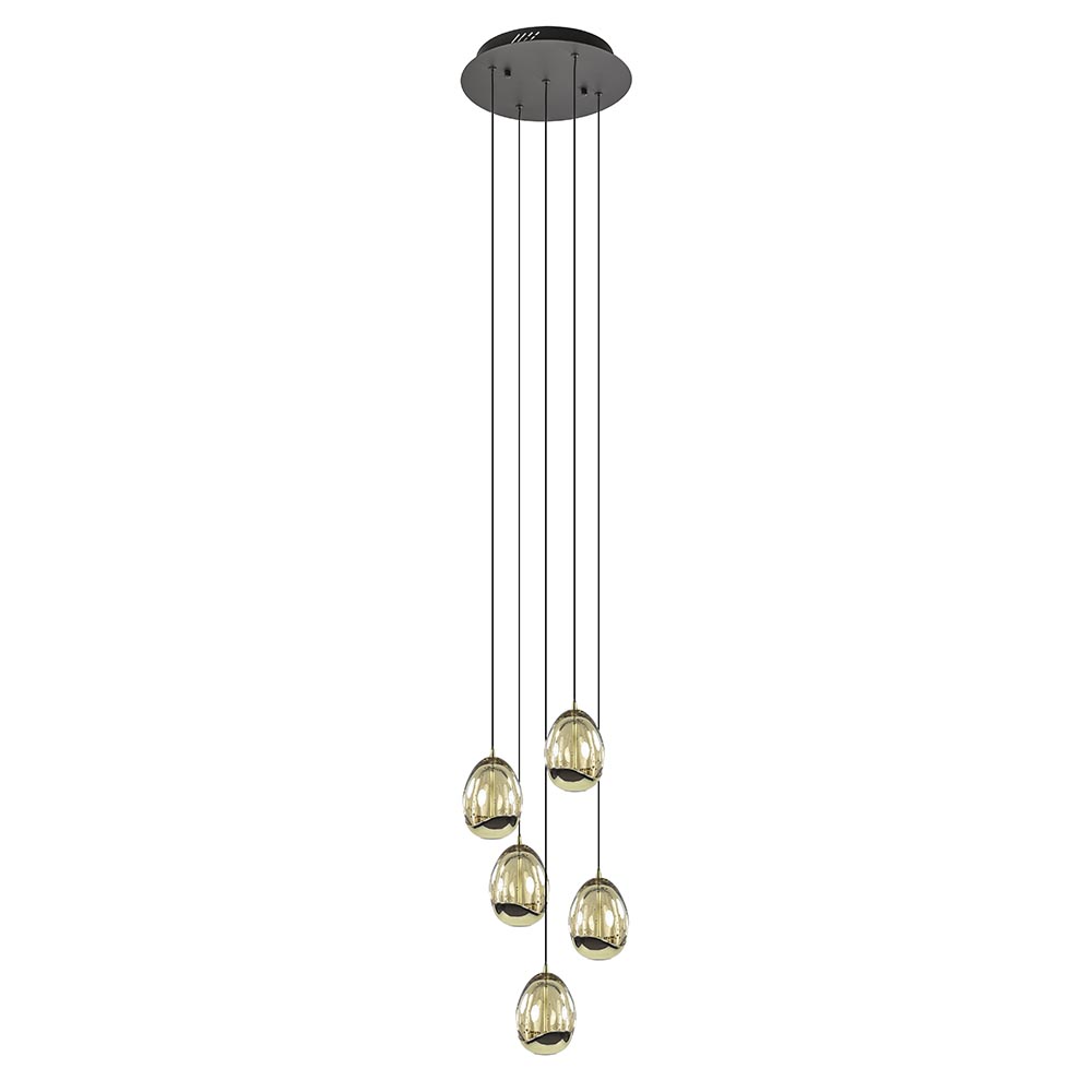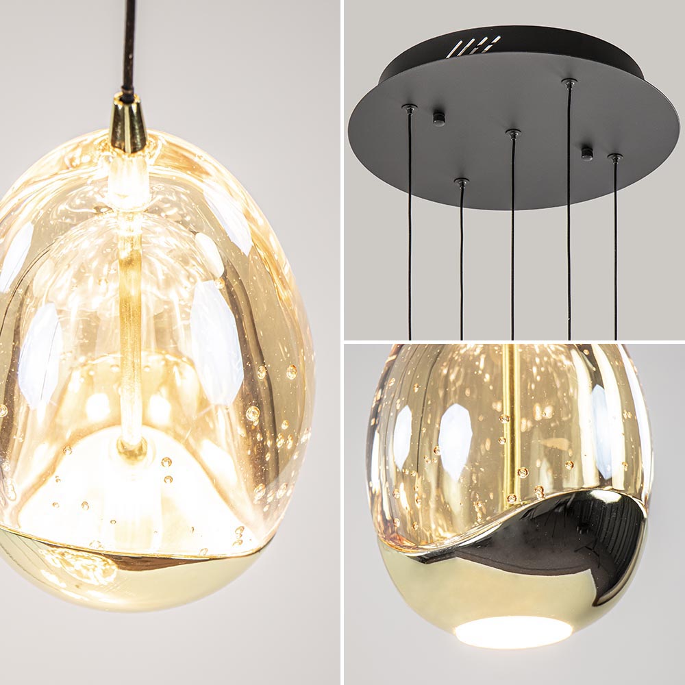 Een sfeervolle toevoeging voor een woon- of eetkamer. De kappen zijn gevormd als een ei en voorzien van LED verlichting. De kap is deels van massief glas en deels van metaal dat is uitgevoerd in glanzend goud. Dit geeft de kap een luxe uitstraling. Het glas is voorzien van belletjes wat een mooi effect geeft wanneer de lamp wordt ingeschakeld. De verlichting geeft direct licht naar beneden dmv de spot onderop het ei, en daarnaast ook indirect licht door het licht binnenin het ei. De 5-lichts hanglamp golden egg is naar wens in hoogte te verstellen. Dit werkt gemakkelijk dmv een trekontlaster. De hanglamp is dimbaar middels een externe dimmer (exclusief).