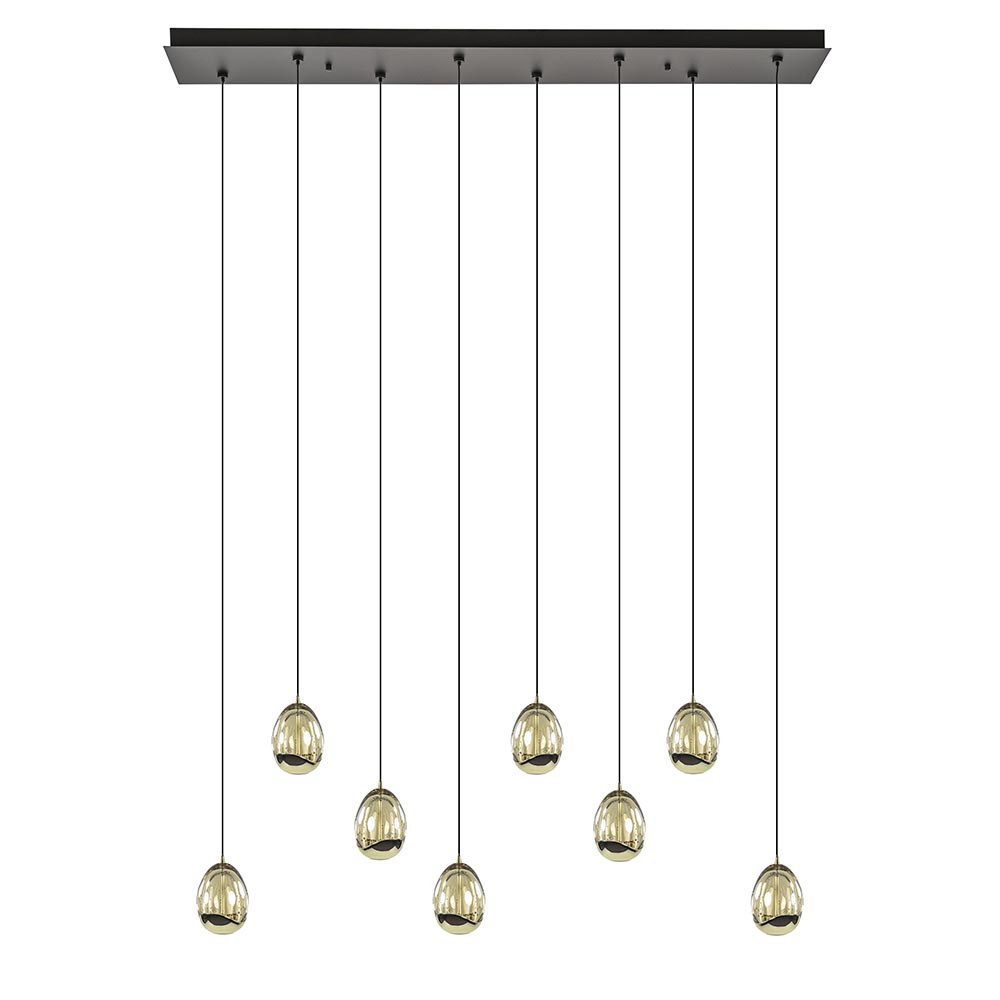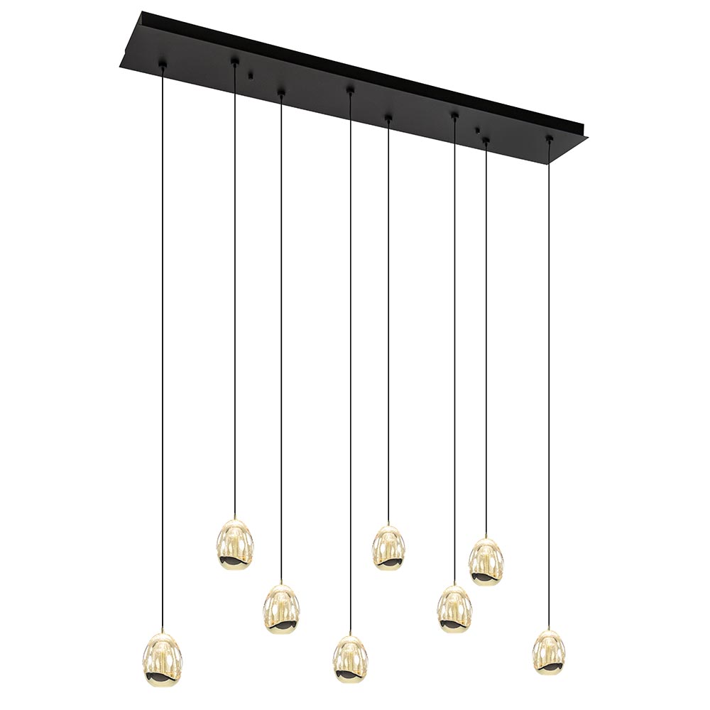 Eieren voor uw geld? Dat kan nu letterlijk met deze moderne hanglamp. De kappen zijn gevormd als een ei en voorzien van LED verlichting. De kap is deels van massief glas en deels van metaal dat is uitgevoerd in glanzend goud. Dit geeft de kap een luxe uitstraling. Het glas is voorzien van belletjes wat een mooi effect geeft wanneer de lamp wordt ingeschakeld. De verlichting geeft direct licht naar beneden dmv de spot onderop het ei, en daarnaast ook indirect licht door het licht binnenin het ei. De 8 kappen zijn gemakkelijk naar wens op hoogte te hangen dmv een trekontlaster. De 8-lichts hanglamp wordt opgehangen met een mat zwarte balk van 115 cm.