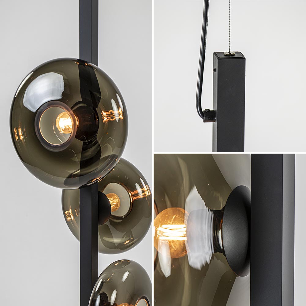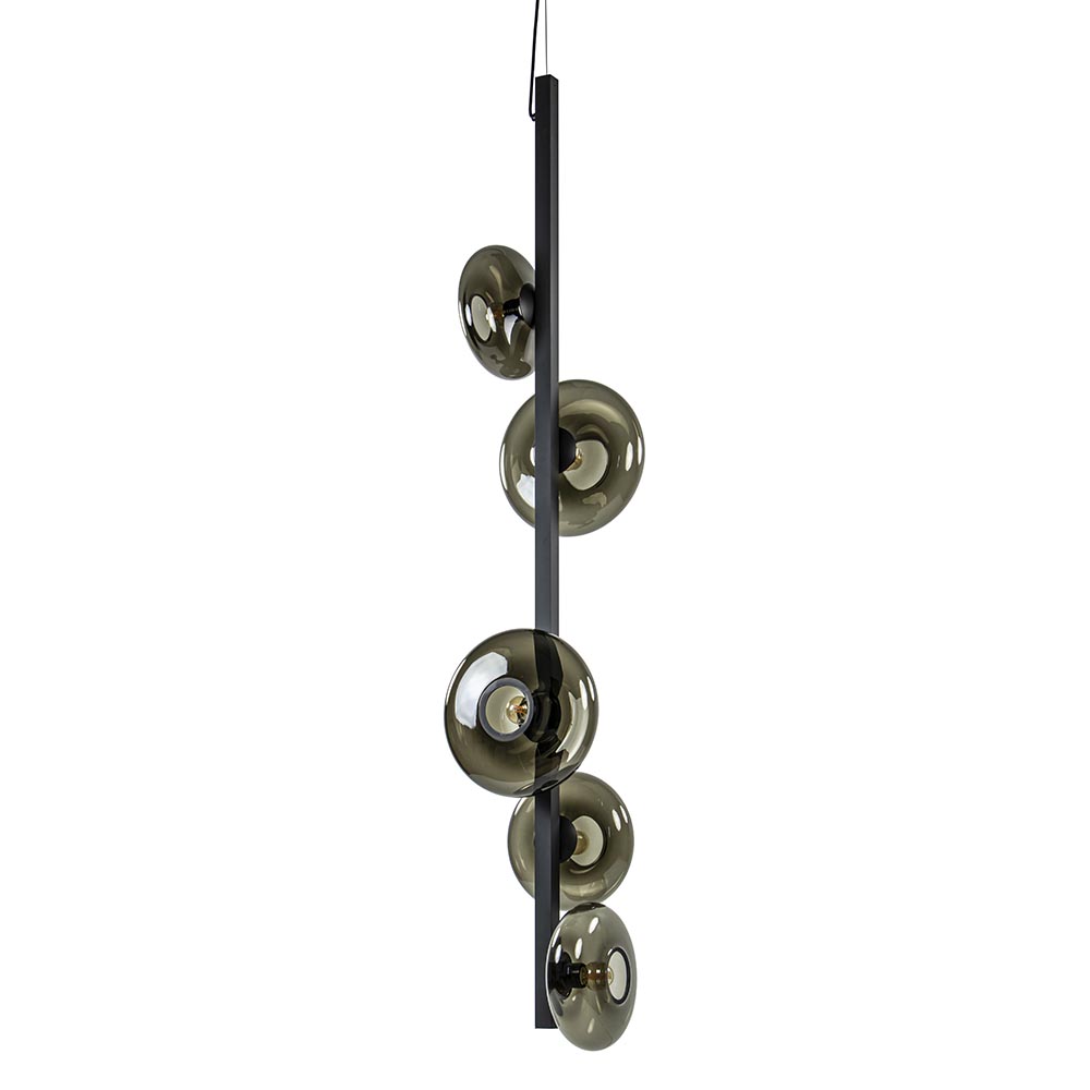Deze langwerpige hanglamp is een mooie eyecatcher voor een vide. De lamp heeft een speels design die bestaat uit een mat zwarte metalen balk waar 5 lichtpunten op zijn verwerkt. Ieder punt ondersteund een ronde smoke glazen kap die zijn verdeeld over 2 afmetingen. Het donkere glas zorgt voor een fijne sfeer en geeft een luxe uitstraling aan de ruimte. De smoke glazen hanglamp heeft een hoogte van 310 cm, waarvan de kap zelf 160 cm is. De grote kap hangt aan een staaldraad en een zwart snoer die beide naar wens zijn in te korten. De videlamp wordt geleverd zonder lichtbronnen (5x E27).