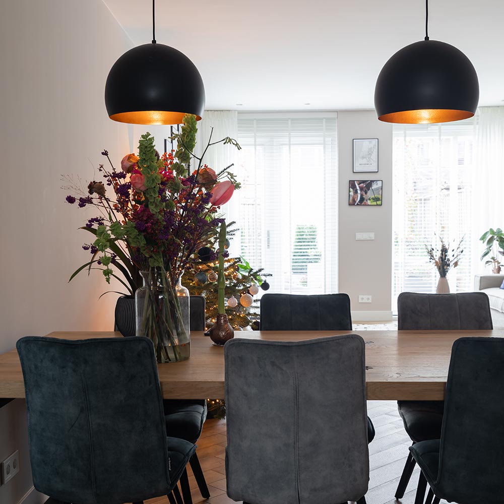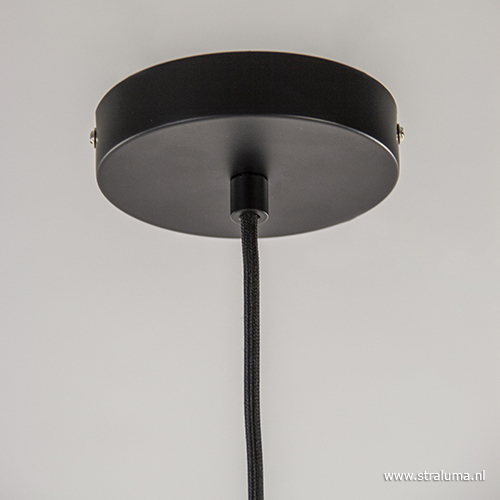 Modern, stoer en een tikkeltje klassiek, deze mat zwarte hanglamp met goud. De design lamp past door z’n formaat op vele plekken in huis en werkt dan ook mooi als sfeerverlichting. De metalen kap heeft een gouden binnenzijde die zorgt voor een warme en sfeervolle verlichting. De kap hangt aan een zwart stof omwonden snoer en is naar wens in te korten. De hanglamp wordt aan het plafond bevestigd met een ronde ophanging. Door de kleuren combinatie van zwart en goud matched deze hanglamp goed met verschillende stijlen interieurs als modern, design of industrieel.