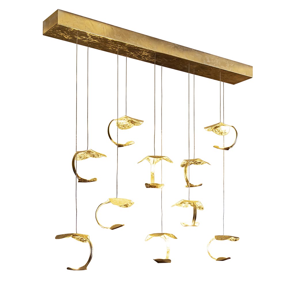 – hoogte: 130 cm – kappen: 18x18x16 cm – bevestiging: 120x15x7 cm – metaal – goldleaf – inclusief LED – 5,5W – 10x 850 lumen – 2700 Kelvin – dimbaar (exclusief)